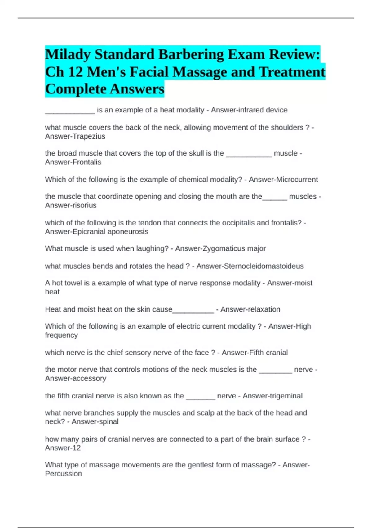 Milady Standard Barbering Exam Review: Ch 12 Men's Facial Massage and Treatment Complete Answers