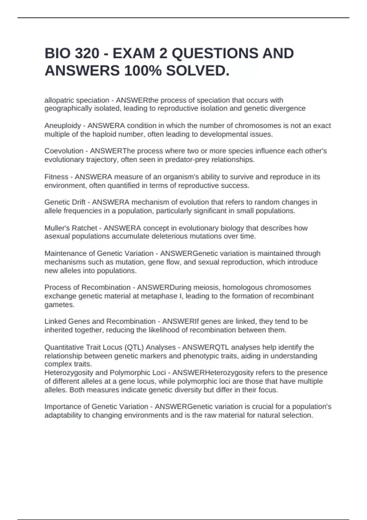 BIO 320 - EXAM 2 QUESTIONS AND ANSWERS 100% SOLVED.
