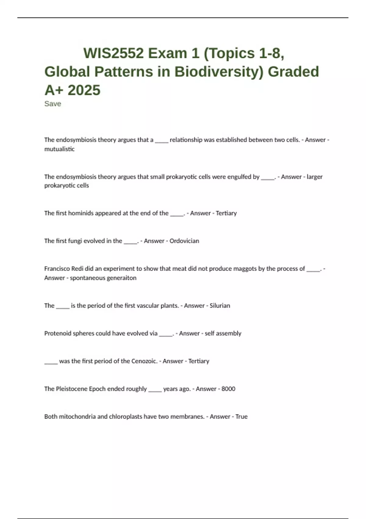 WIS2552 Exam 1 (Topics 1-8, Global Patterns in Biodiversity) Graded A+ 2025 Save