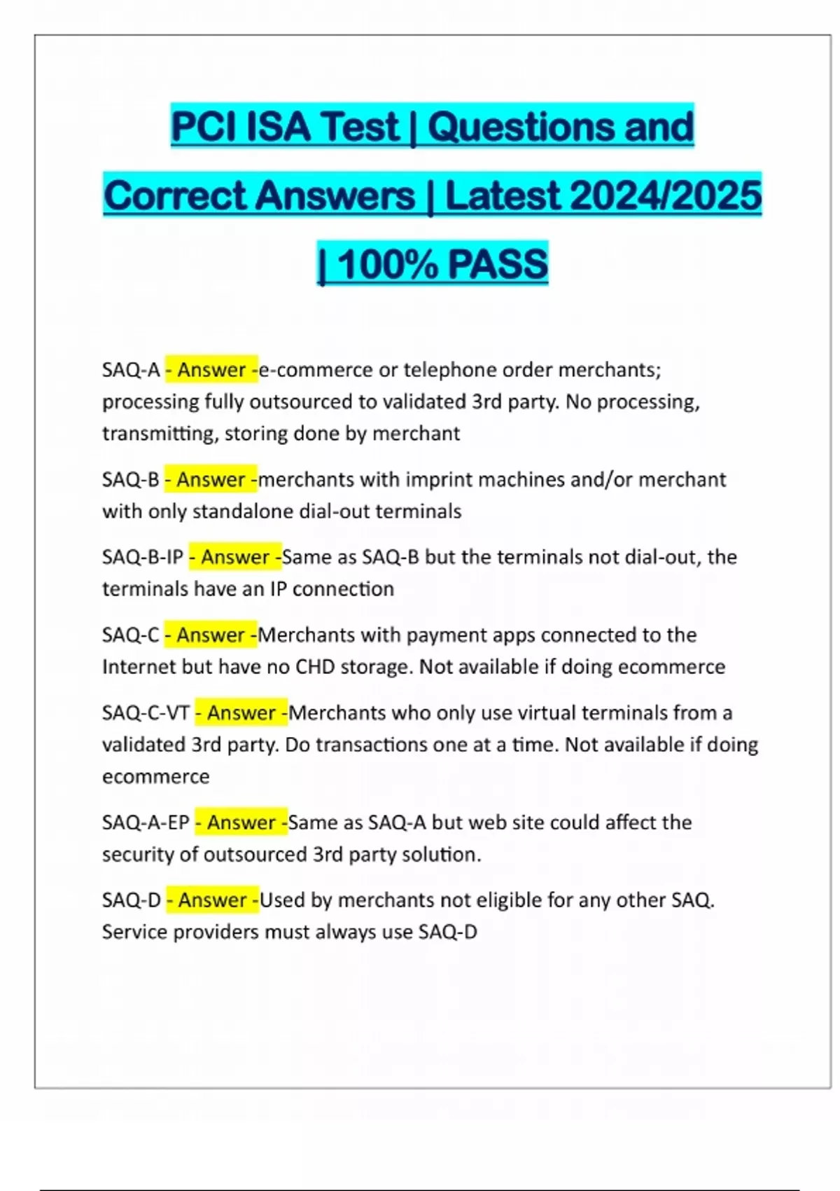 PCI ISA Test | Questions and Correct Answers | Latest 2024/2025 | 100% PASS SAQ-A - Answer -e-commerce or telephone order merchants; processing fully outsourced to validated 3rd party. No processing, transmitting, storing done by merchant SAQ-B - Answer -merchants with imprint machines and/or merchant with only standalone dial-out terminals SAQ-B-IP - Answer -Same as SAQ-B but the terminals not dial-out, the terminals have an IP connection SAQ-C - Answer -Merchants with payment apps connected to t