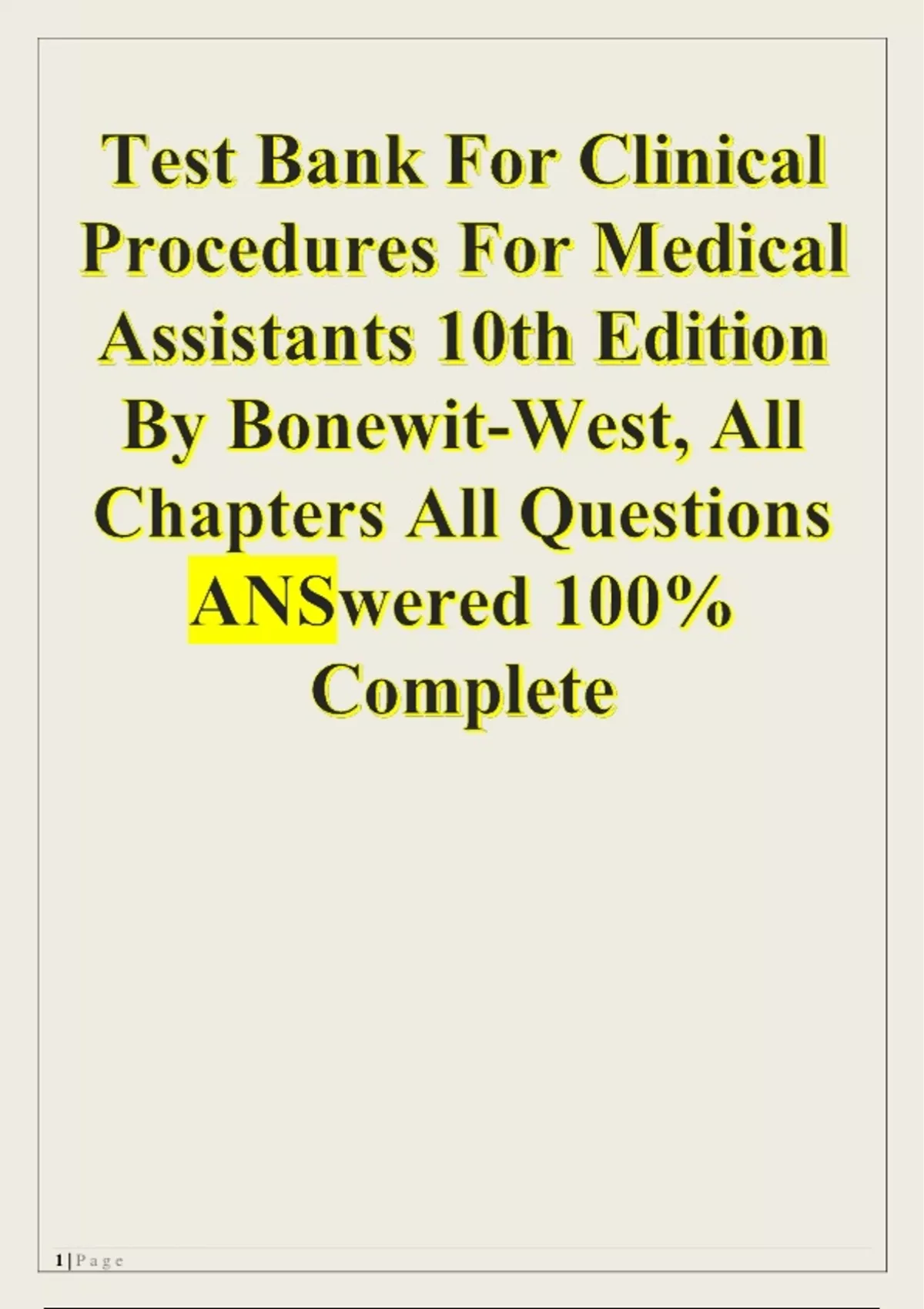 Test Bank For Clinical Procedures For Medical Assistants 10th Edition By Bonewit-West, All Chapters All Questions ANSwered 100% Complete