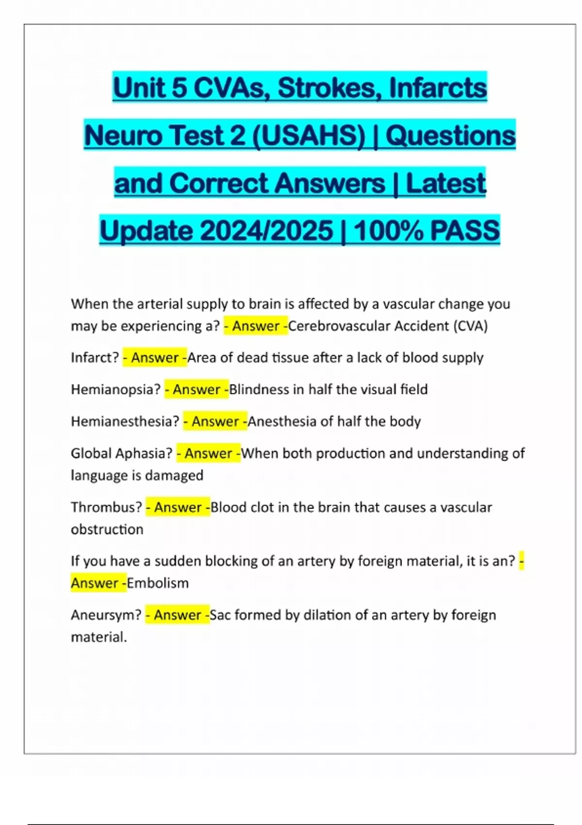 Unit 5 CVAs, Strokes, Infarcts Neuro Test 2 (USAHS) | Questions and Correct Answers | Latest Update 2024/2025 | 100% PASS When the arterial supply to brain is affected by a vascular change you may be experiencing a? - Answer -Cerebrovascular Accident (CVA) Infarct? - Answer -Area of dead tissue after a lack of blood supply Hemianopsia? - Answer -Blindness in half the visual field Hemianesthesia? - Answer -Anesthesia of half the body Global Aphasia? - Answer -When both production and understanding of language is damaged Thrombus? - Answer -Blood clot in the brain that causes a vascular obstruction If you have a sudden blocking of an artery by foreign material, it is an? - Answer -Embolism Aneursym? - Answer -Sac formed by dilati
