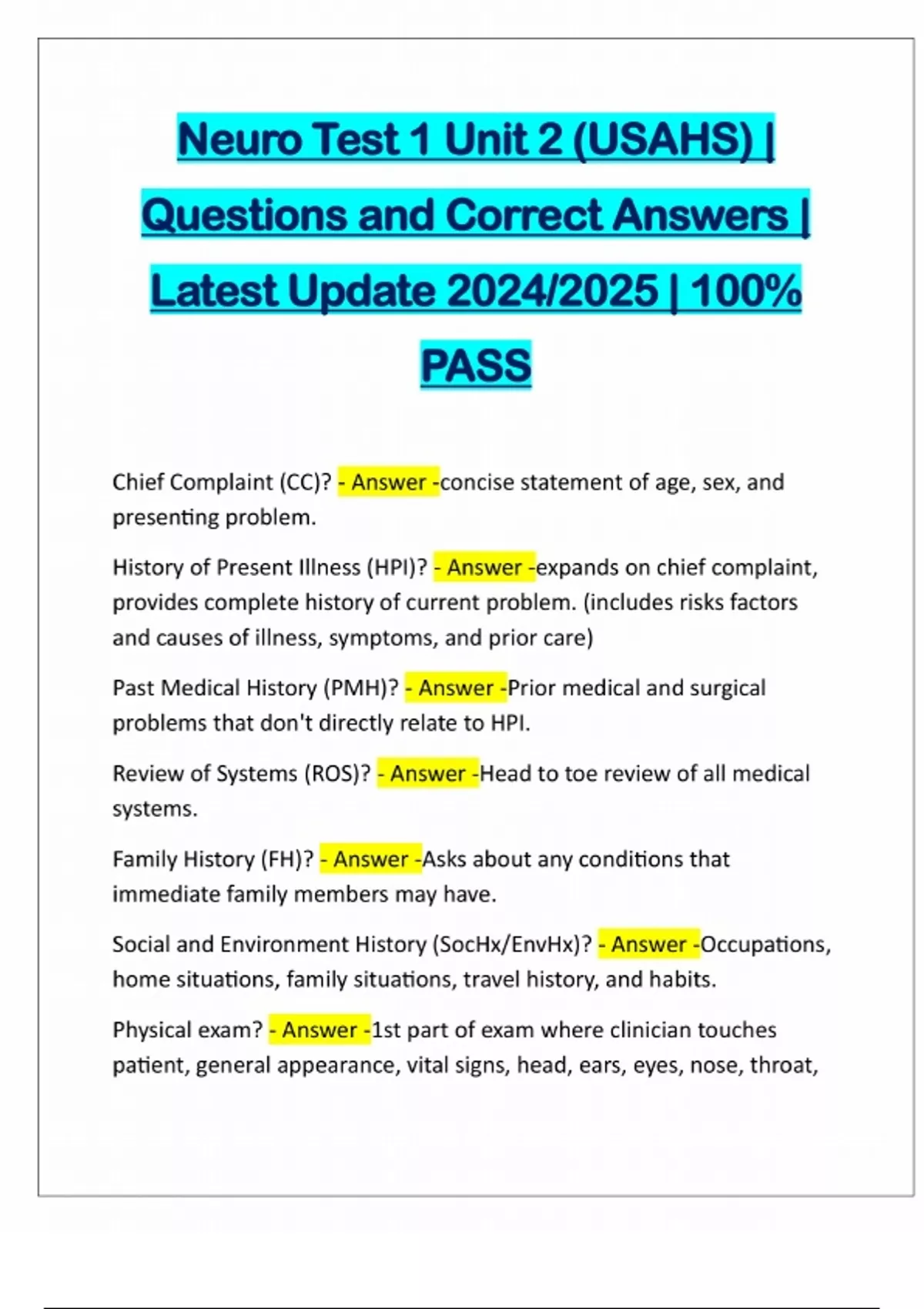 Neuro Test 1 Unit 2 (USAHS) | Questions and Correct Answers | Latest Update 2024/2025 | 100% PASS Chief Complaint (CC)? - Answer -concise statement of age, sex, and presenting problem. History of Present Illness (HPI)? - Answer -expands on chief complaint, provides complete history of current problem. (includes risks factors and causes of illness, symptoms, and prior care) Past Medical History (PMH)? - Answer -Prior medical and surgical problems that don't directly relate to HPI. Review of Systems (ROS)? - Answer -Head to toe review of all medical systems. Family History (FH)? - Answer -Asks about a