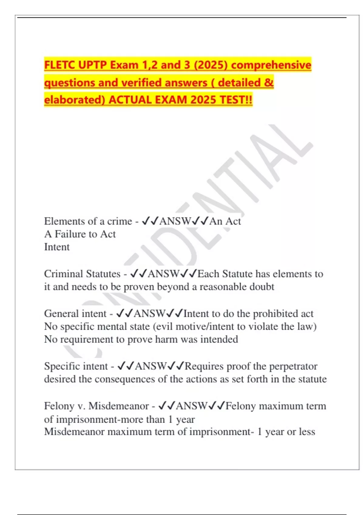FLETC UPTP Exam 1,2 and 3 (2025) comprehensive questions and verified answers ( detailed & elaborated) ACTUAL EXAM 2025 TEST!! Elements of a crime - ANSWAn Act A Failure to Act Intent
