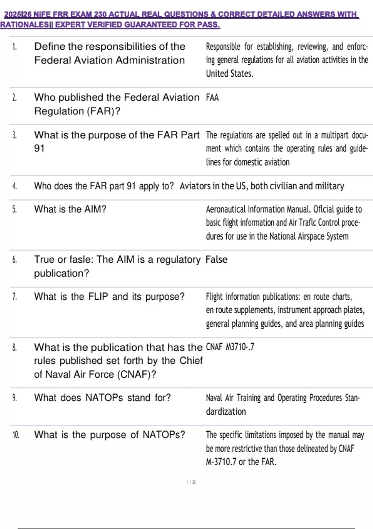 2025|26 NIFE FRR EXAM 230 ACTUAL REAL QUESTIONS & CORRECT DETAILED ANSWERS WITH RATIONALES|| EXPERT VERIFIED GUARANTEED FOR PASS. 1. Define the responsibilities of the Federal Aviation Administration 2. Who published the Federal Aviation Regulation (FAR)? 3. What is the purpose of the FAR Part 91 Responsible for establishing, reviewing, and enforc- ing general regulations for all aviation activities in the United States. FAA The regulations are spelled out in a multipart docu- ment which contains the operating rules and guide- lines for domestic aviation 4. Who does the FAR part 91 apply to? Aviators in the US, both civilian and military 5. What is the AIM? Aeronautical Information Manual. Oflcial guide to basic flight information and Air Traflc Control proce- dures for use in the National Airspace System 6. True or fasle: The AIM is a regulatory False publication? 7. What is the FLIP and its purpose? Flight information publications: en route charts, en route supplements, instrument approach plates, general planning guides, and area planning guides 8. What is the publication that has the rules published set forth by the Chief of Naval Air Force (CNAF)? CNAF M3710-.7 9. What does NATOPs stand for? Naval Air Training and Operating Procedures Stan- dardization 10. What is the purpose of NATOPs? The specific limitations imposed by the manual may be more restrictive than those delineated by CNAF M-3710.7 or the FAR.