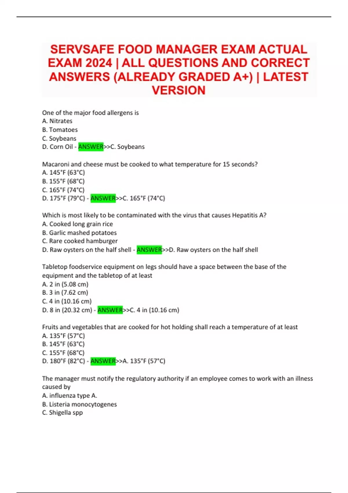 SERVSAFE FOOD MANAGER EXAM ACTUAL