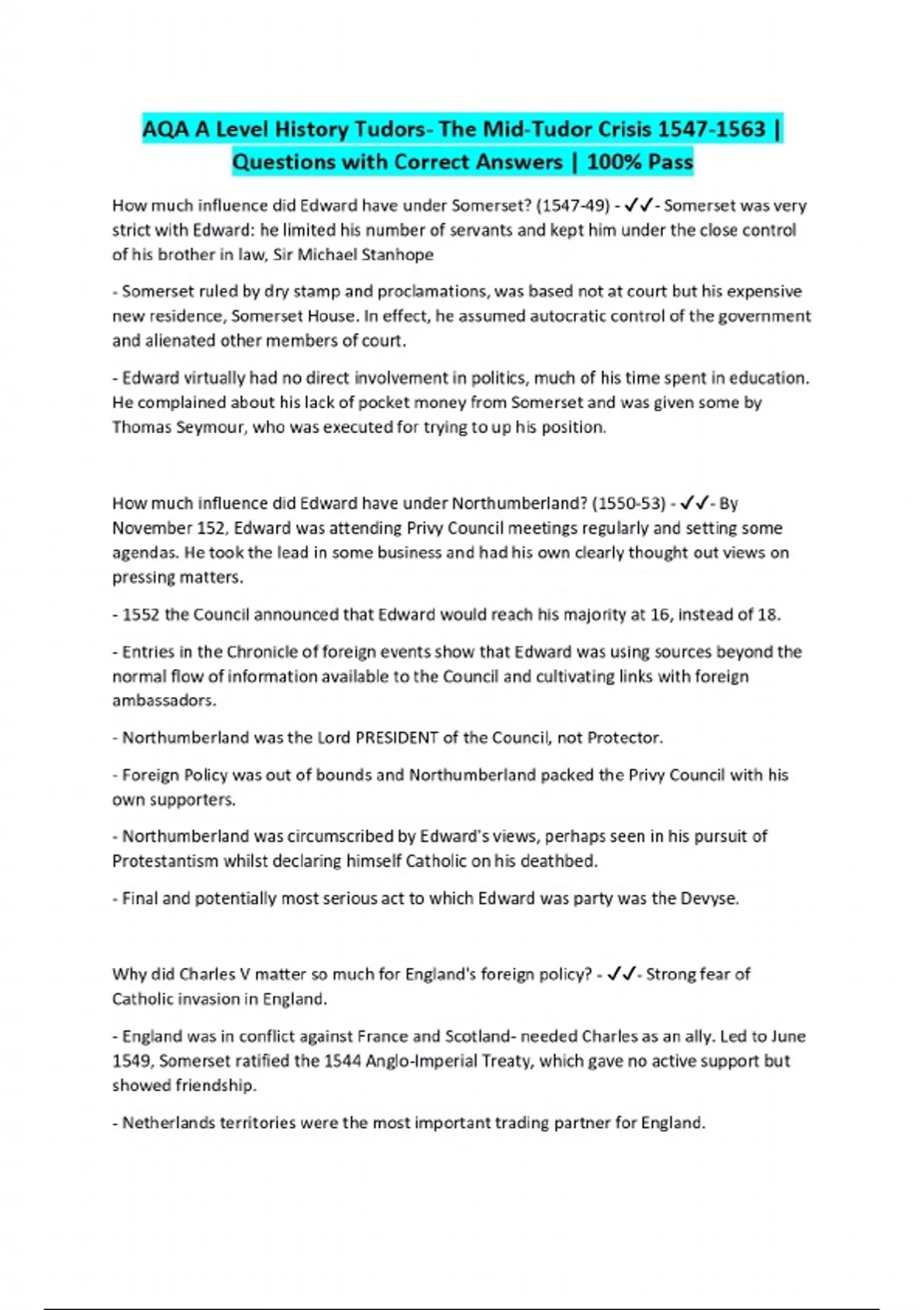AQA A Level History Tudors- The Mid-Tudor Crisis | Questions with Correct Answers | 100% Pass