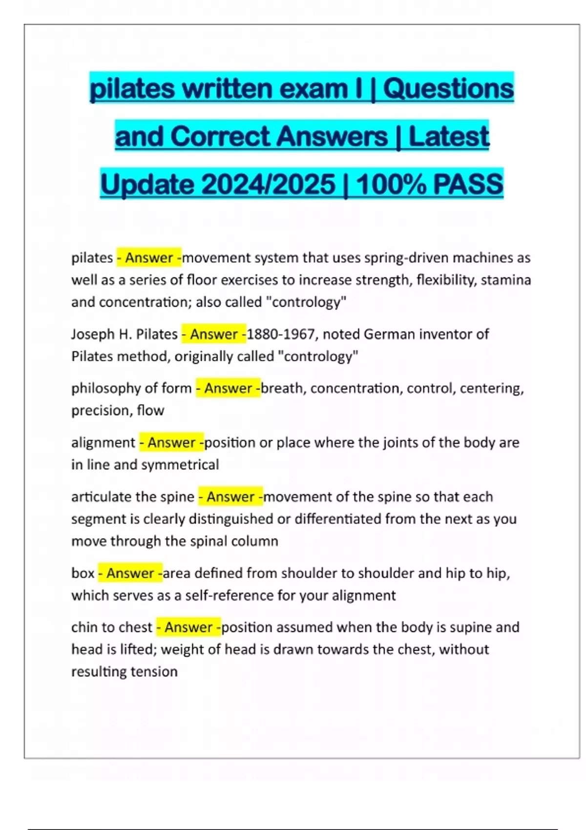 pilates written exam I | Questions and Correct Answers | Latest Update 2024/2025 | 100% PASS