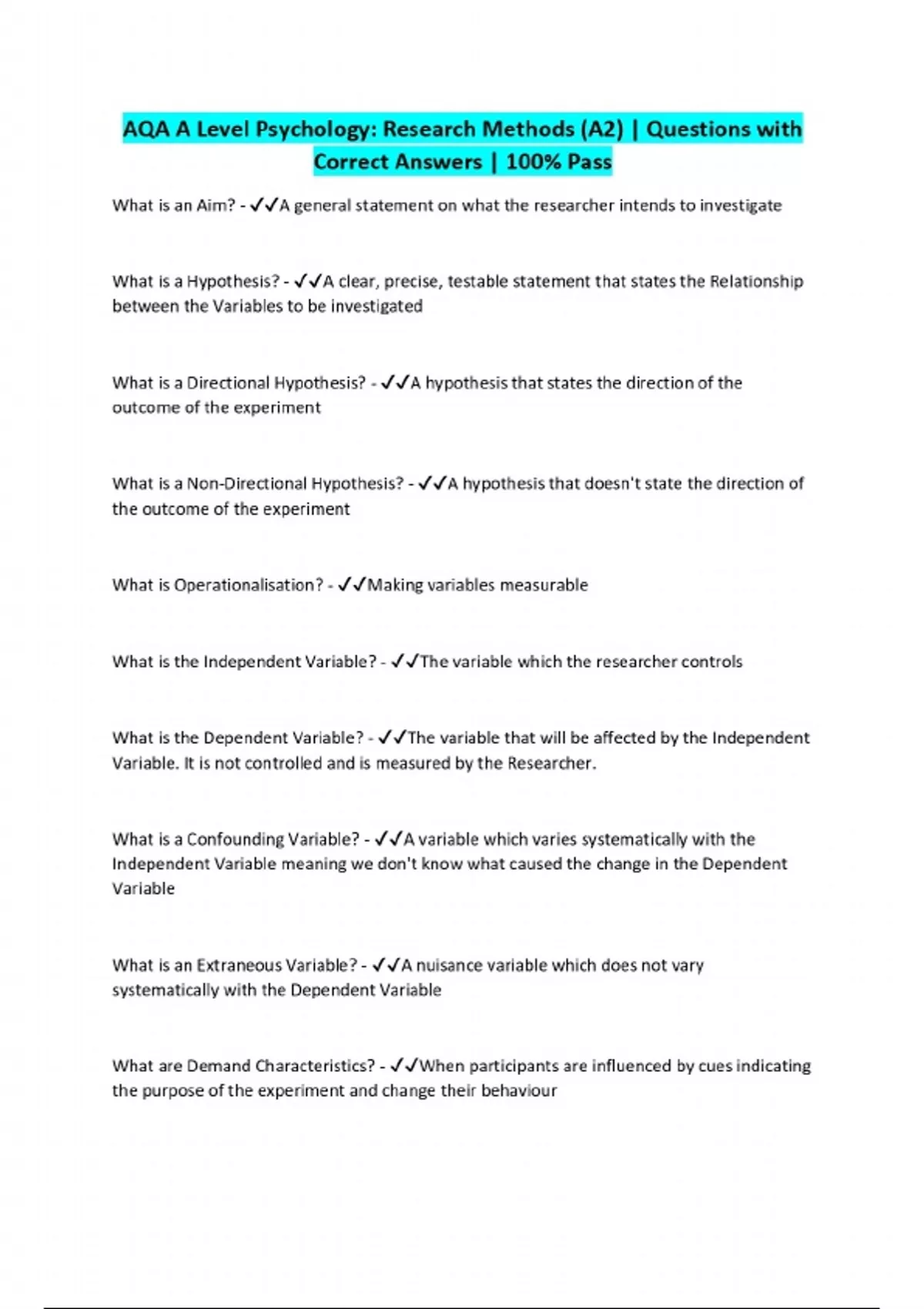 AQA A Level Psychology: Research Methods (A2) | Questions with Correct Answers | 100% Pass