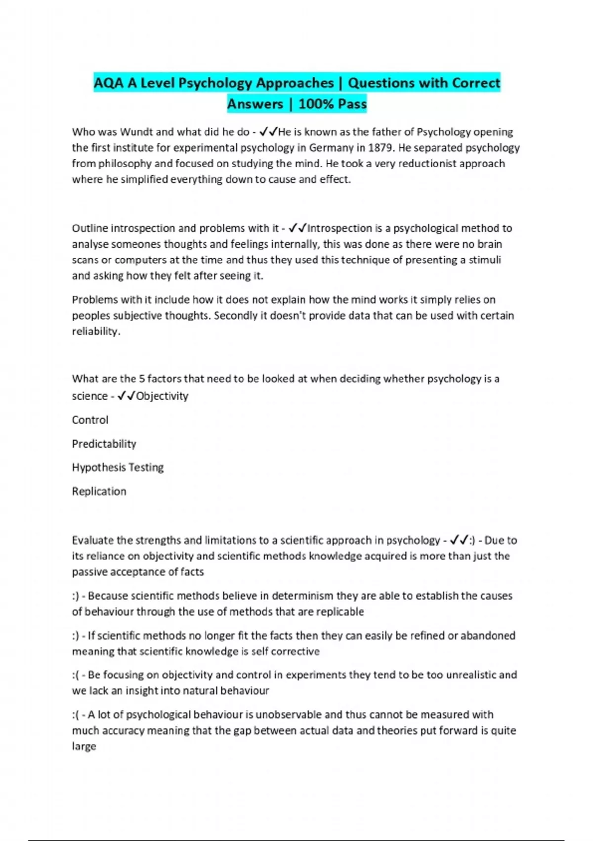 AQA A Level Psychology Approaches | Questions with Correct Answers | 100% Pass