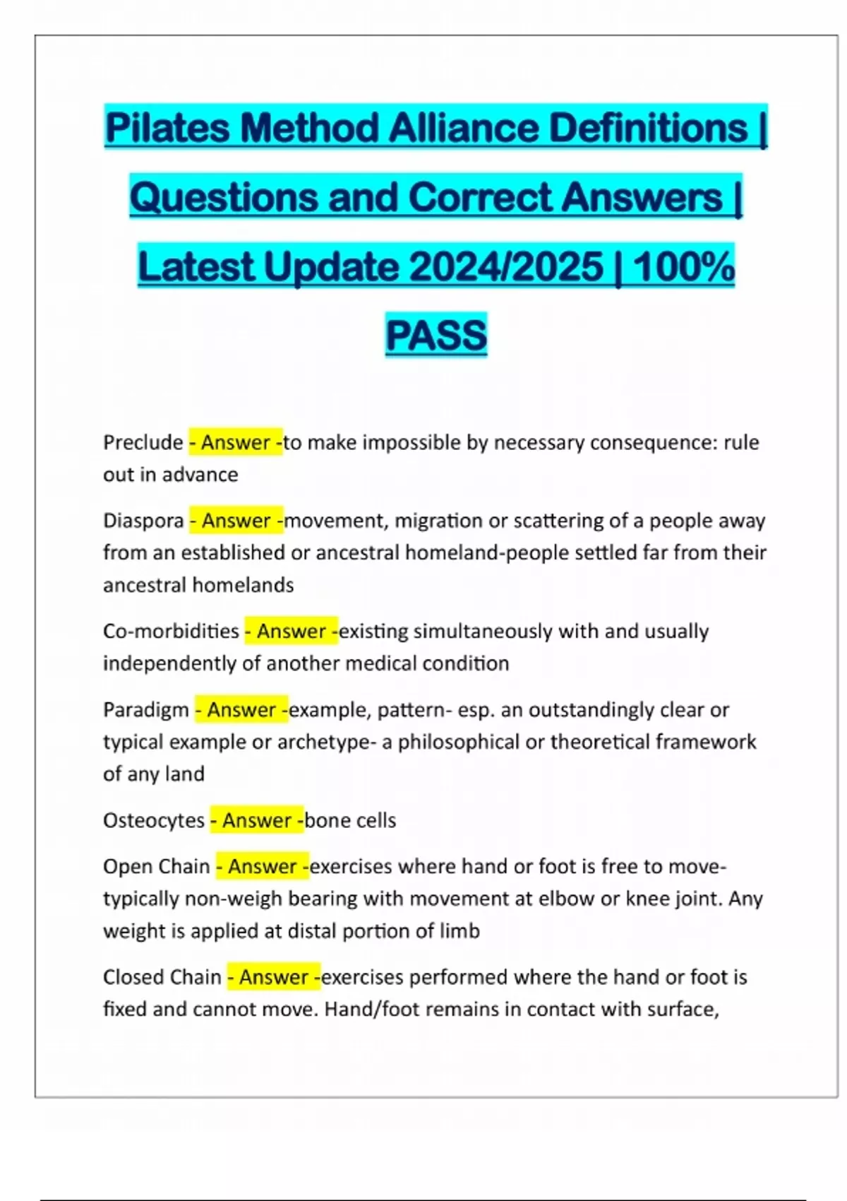 Pilates Method Alliance Definitions | Questions and Correct Answers | Latest Update 2024/2025 | 100% PASS Preclude - Answer -to make impossible by necessary consequence: rule out in advance Diaspora - Answer -movement, migration or scattering of a people away from an established or ancestral homeland-people settled far from their ancestral homelands Co-morbidities - Answer -existing simultaneously with and usually independently of another medical condition Paradigm - Answer -example, pattern- esp. an outstandingly clear or typical example or archetype- a philosophical or theoretical framework of any land Osteocytes - Answer -bone cells Open Chain - Answer -exercises where hand or foot is free