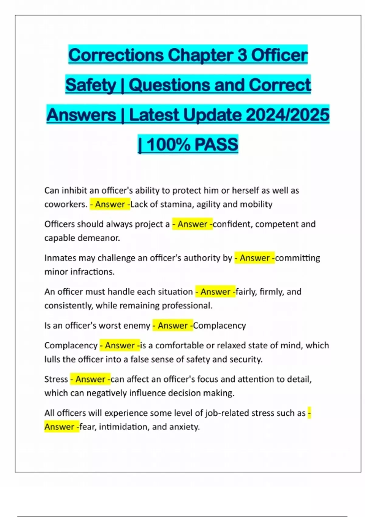 Corrections Chapter 3 Officer Safety | Questions and Correct Answers | Latest Update 2024/2025 | 100% PASS Can inhibit an officer's ability to protect him or herself as well as coworkers. - Answer -Lack of stamina, agility and mobility Officers should always project a - Answer -confident, competent and capable demeanor. Inmates may challenge an officer's authority by - Answer -committing minor infractions. An officer must handle each situation - Answer -fairly, firmly, and consistently, while remaining professional. Is an officer's worst enemy - Answer -Complacency Complacency - Answer -is a comfortable or relaxed state of mind, which lulls the officer into a false sense of safety and security. Stress - Answer -can affect an officer's focus and attention to detail, which can negatively influence decision making. All officers will experience some level of job-rela