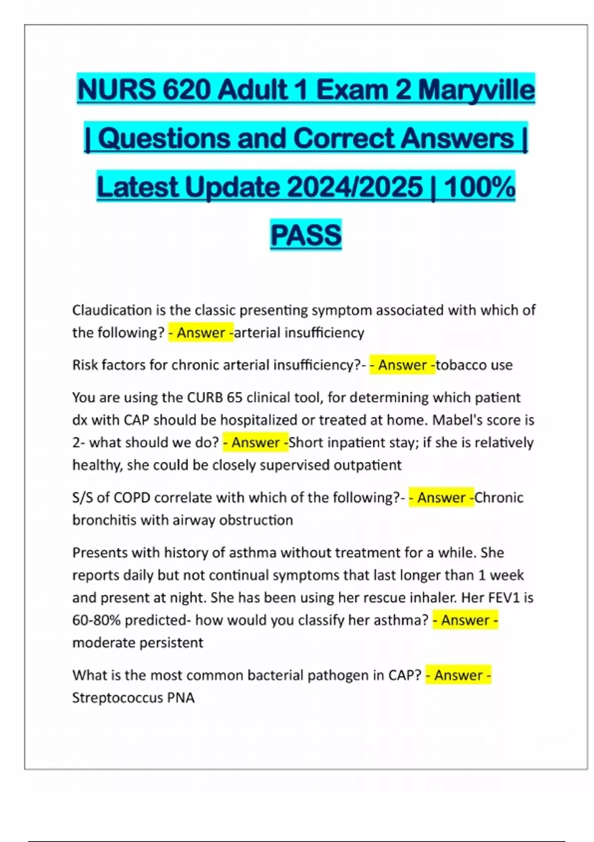 NURS 620 Adult 1 Exam 2 Maryville | Questions and Correct Answers | Latest Update 2024/2025 | 100% PASS Claudication is the classic presenting symptom associated with which of the following? - Answer -arterial insufficiency Risk factors for chronic arterial insufficiency?- - Answer -tobacco use You are using the CURB 65 clinical tool, for determining which patient dx with CAP should be hospitalized or treated at home. Mabel's score is 2- what should we do? - Answer -Short inpatient stay; if she is relatively healthy, she could be closely supervised outpatient S/S of COPD correlate with which of the following?- - Answer -Chronic bronchitis with airway obstruction