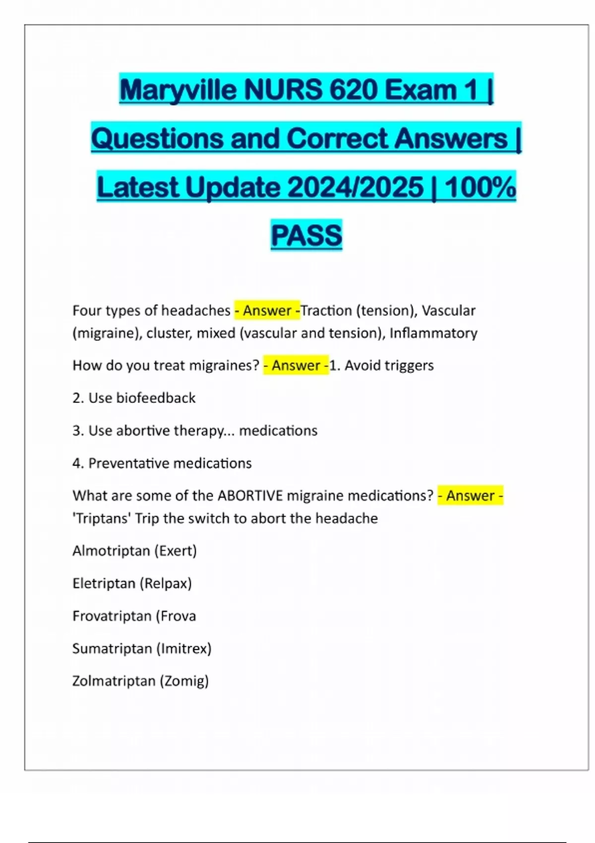 Maryville NURS 620 Exam 1 | Questions and Correct Answers | Latest Update 2024/2025 | 100% PASS Four types of headaches - Answer -Traction (tension), Vascular (migraine), cluster, mixed (vascular and tension), Inflammatory How do you treat migraines? - Answer -1. Avoid triggers 2. Use biofeedback 3. Use abortive therapy... medications 4. Preventative medications What are some of the ABORTIVE migraine medications? - Answer - 'Triptans' Trip the switch to abort the headache Almotriptan (Exert) Eletriptan (Relpax) Frovatriptan (Frova Sumatriptan (Imitrex) Zolmatriptan (Zomig)PREVENTATIVE/PROPHYLACTIC migraine medicines - Answer -Betablockers "olol" Propranolol Metoprolol Timolol Atenolol