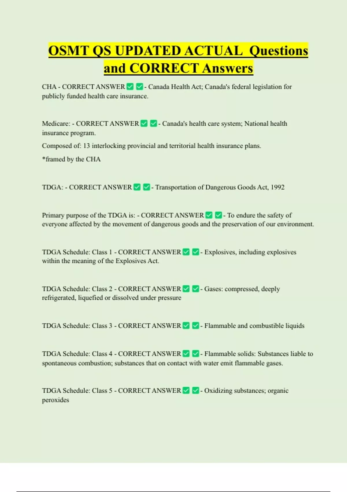 OSMT QS UPDATED ACTUAL Questions and CORRECT Answers CHA - CORRECT ANSWER - Canada Health Act; Canada's federal legislation for publicly funded health care insurance. Medicare: - CORRECT ANSWER - Canada's health care system; National health insurance program. Composed of: 13 interlocking provincial and territorial health insurance plans. *framed by the CHA