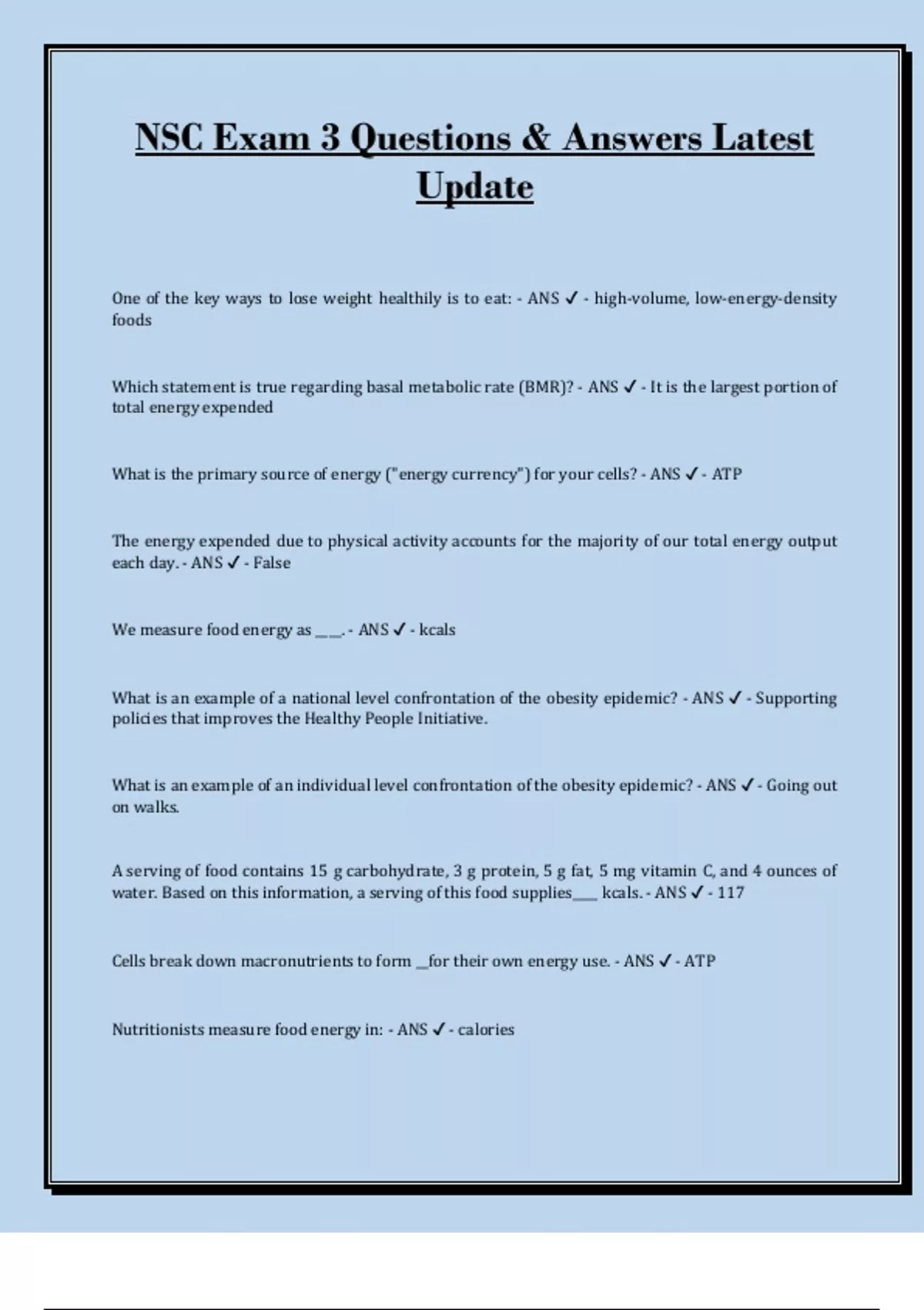 NSC Exam 3 Questions & Answers Latest Update One of the key ways to lose weight healthily is to eat: - ANS - high-volume, low-energy-density foods Which statement is true regarding basal metabolic rate (BMR)? - ANS - It is the largest portion of total energy expended What is the primary source of energy ("energy currency") for your cells? - ANS - ATP The energy expended due to physical activity accounts for the majority of our total energy output each day. - ANS - False We measure food energy as ____. - ANS - kcals What is an example of a national level confrontation of the obesity epidemic? - ANS - Supporting policies that improves the Healthy People Initiative.