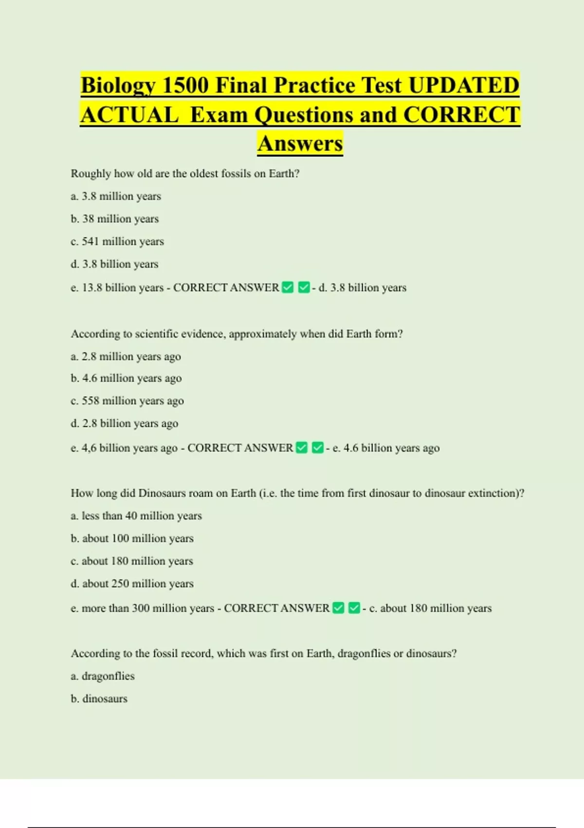 Biology 1500 Final Practice Test UPDATED ACTUAL Exam Questions and CORRECT Answers Roughly how old are the oldest fossils on Earth? a. 3.8 million years b. 38 million years c. 541 million years d. 3.8 billion years e. 13.8 billion years - CORRECT ANSWER - d. 3.8 billion years
