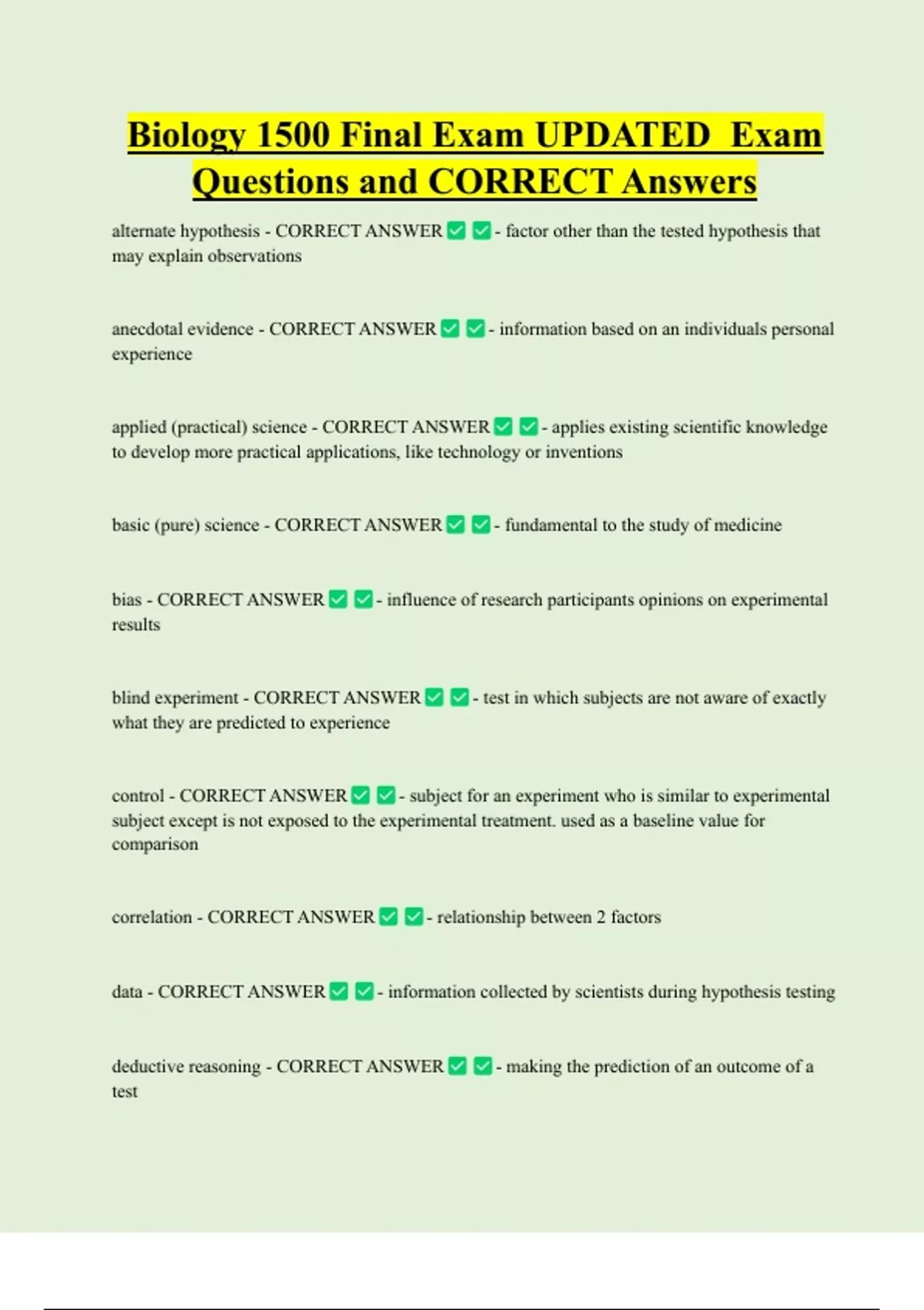 Biology 1500 Final Exam UPDATED Exam Questions and CORRECT Answers alternate hypothesis - CORRECT ANSWER - factor other than the tested hypothesis that may explain observations anecdotal evidence - CORRECT ANSWER - information based on an individuals personal experience applied (practical) science - CORRECT ANSWER - applies existing scientific knowledge to develop more practical applications, like technology or inventions