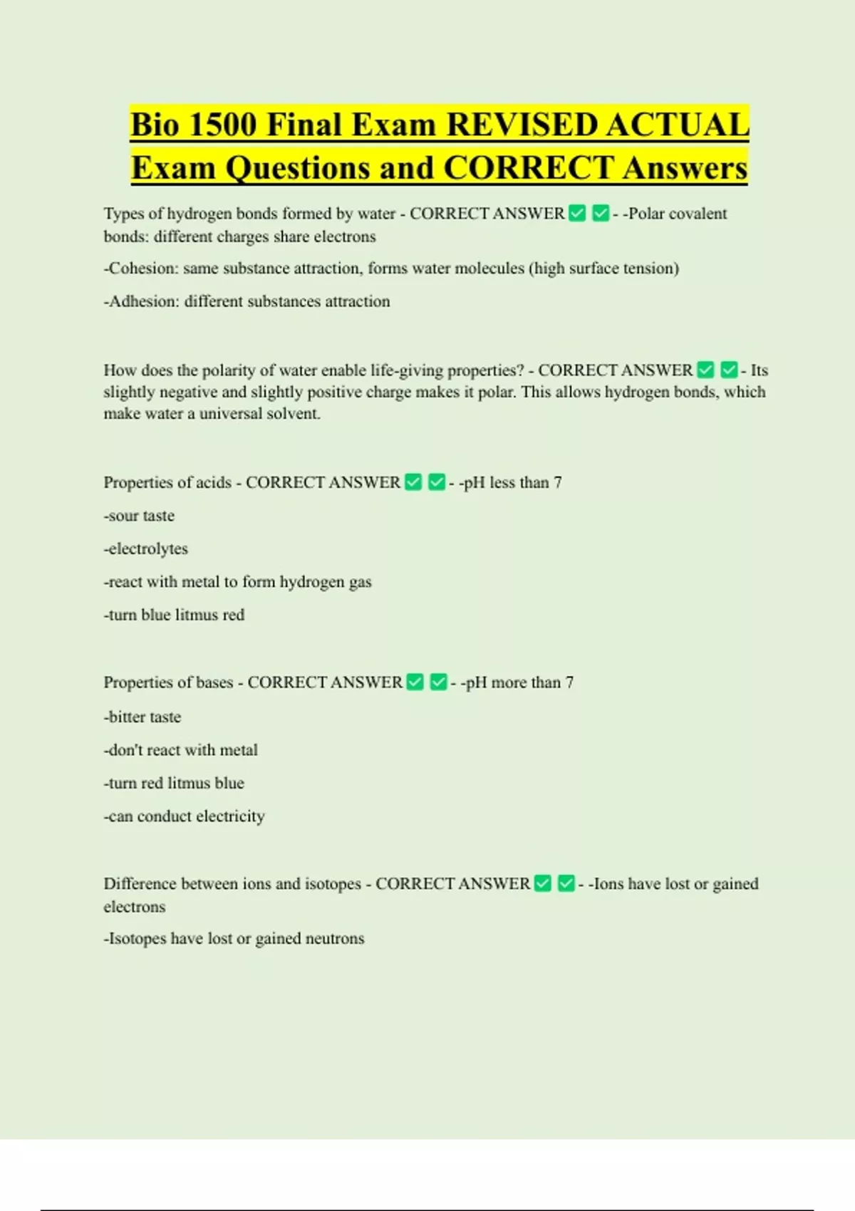 Bio 1500 Final Exam REVISED ACTUAL Exam Questions and CORRECT Answers Types of hydrogen bonds formed by water - CORRECT ANSWER - -Polar covalent bonds: different charges share electrons -Cohesion: same substance attraction, forms water molecules (high surface tension) -Adhesion: different substances attraction