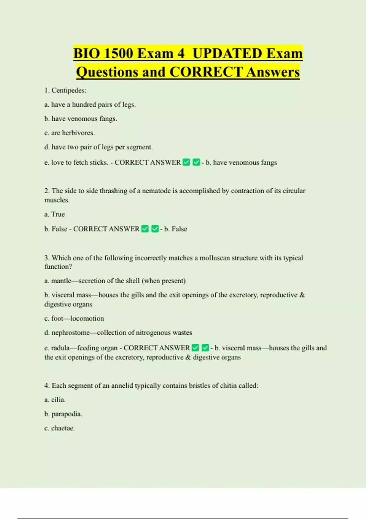 BIO 1500 Exam 4 UPDATED Exam Questions and CORRECT Answers 1. Centipedes: a. have a hundred pairs of legs. b. have venomous fangs. c. are herbivores. d. have two pair of legs per segment. e. love to fetch sticks. - CORRECT ANSWER - b. have venomous fangs