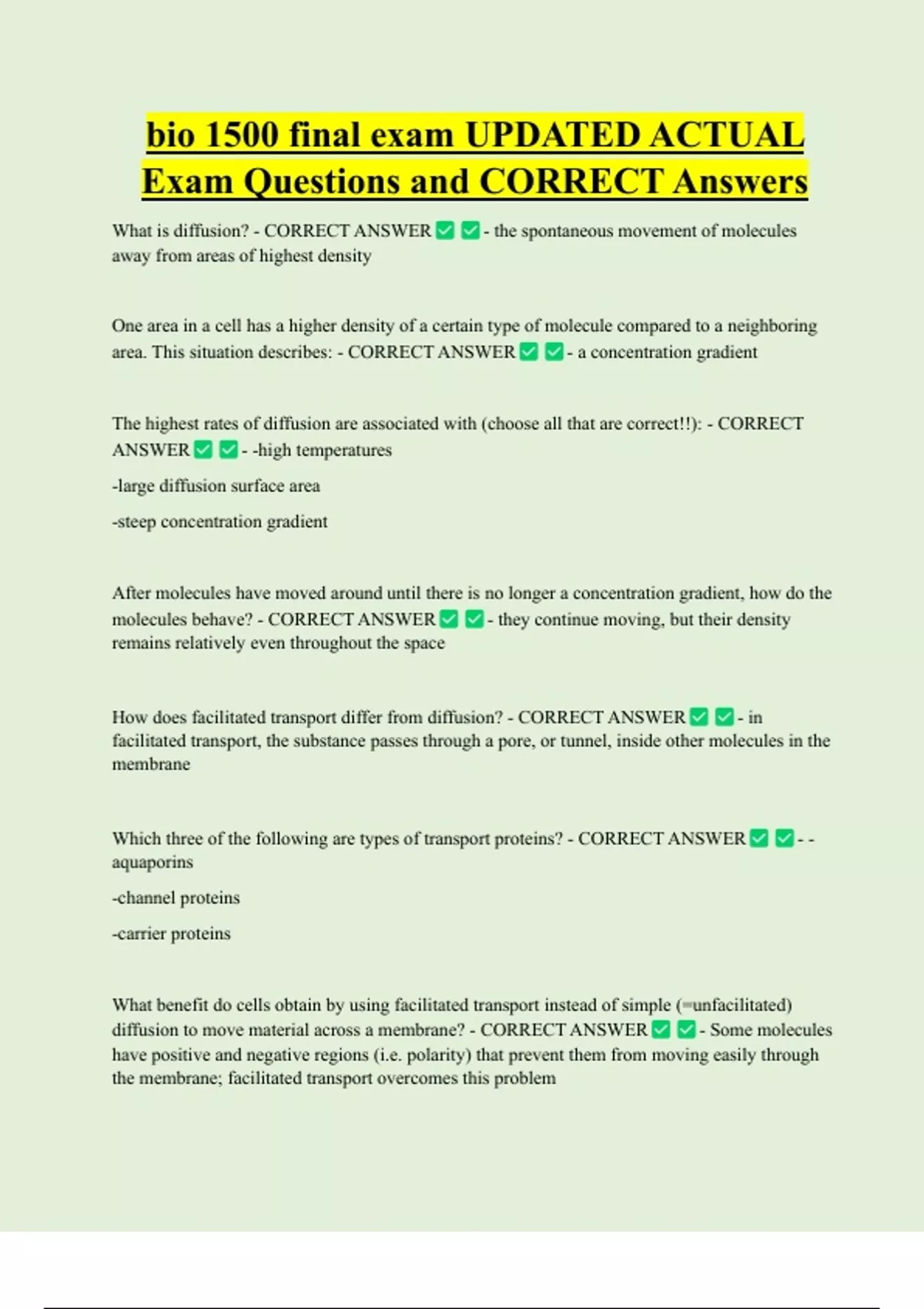 bio 1500 final exam UPDATED ACTUAL Exam Questions and CORRECT Answers What is diffusion? - CORRECT ANSWER - the spontaneous movement of molecules away from areas of highest density One area in a cell has a higher density of a certain type of molecule compared to a neighboring area. This situation describes: - CORRECT ANSWER - a concentration gradient