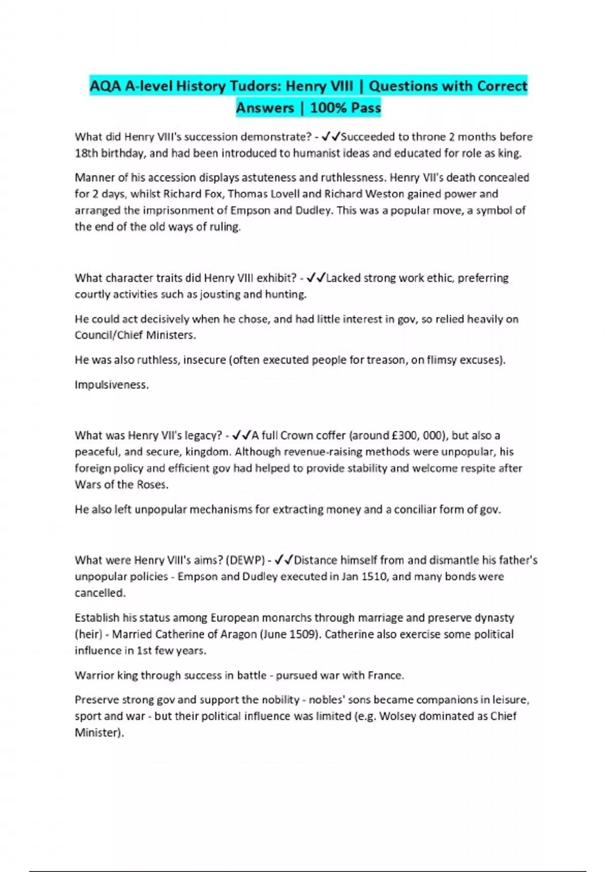 AQA A-level History Tudors: Henry VIII | Questions with Correct Answers | 100% Pass