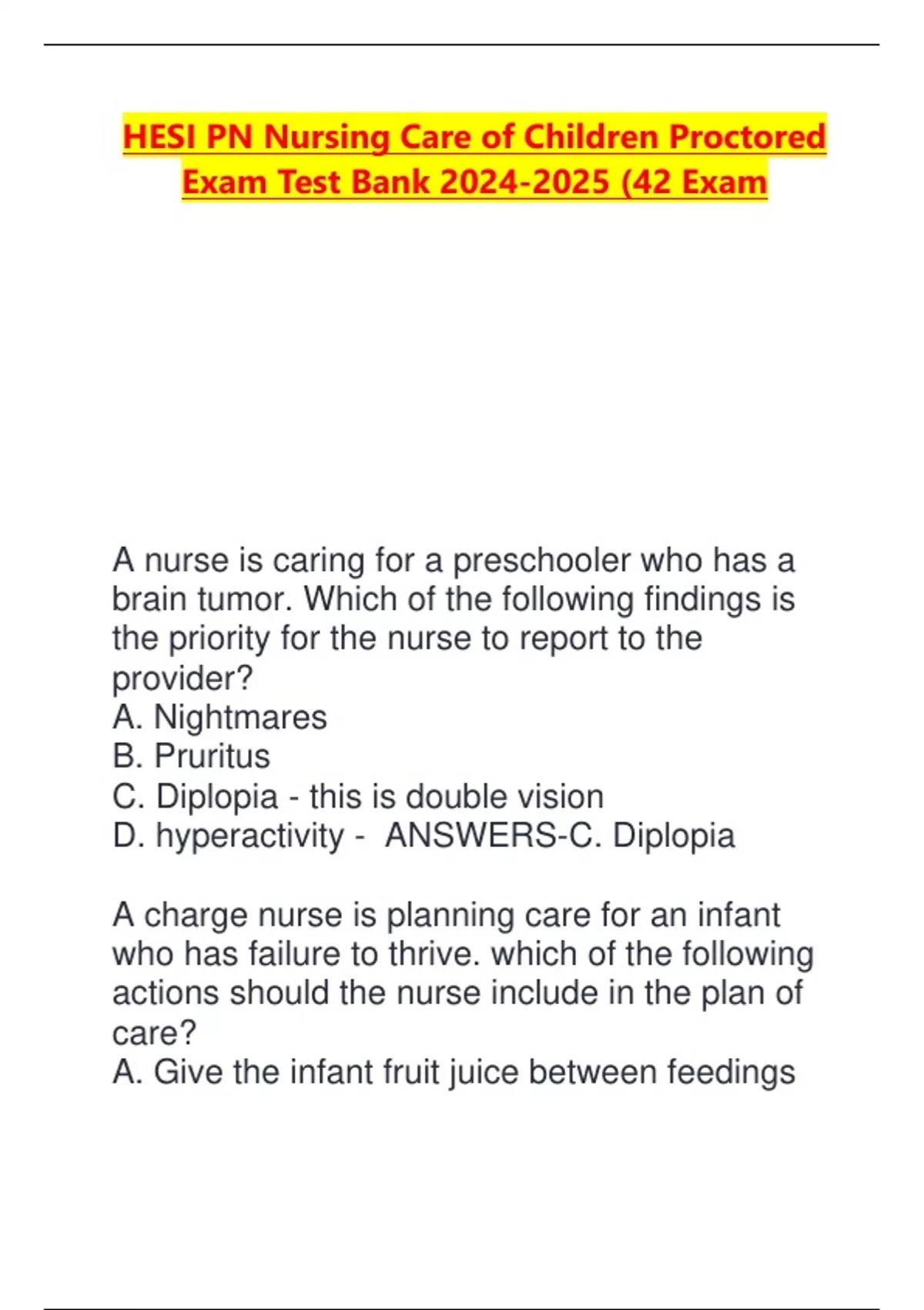 HESI PN Nursing Care of Children Proctored Exam Test Bank (42 Exam