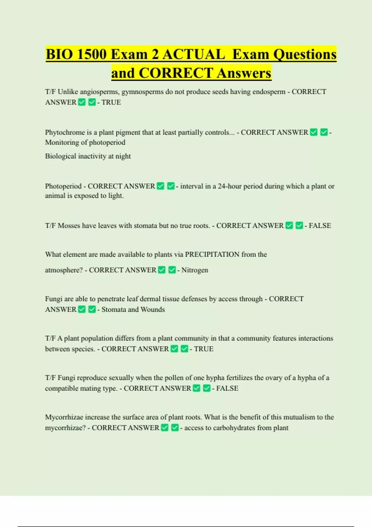 BIO 1500 Exam 2 ACTUAL Exam Questions and CORRECT Answers T/F Unlike angiosperms, gymnosperms do not produce seeds having endosperm - CORRECT ANSWER - TRUE Phytochrome is a plant pigment that at least partially controls... - CORRECT ANSWER - Monitoring of photoperiod Biological inactivity at night