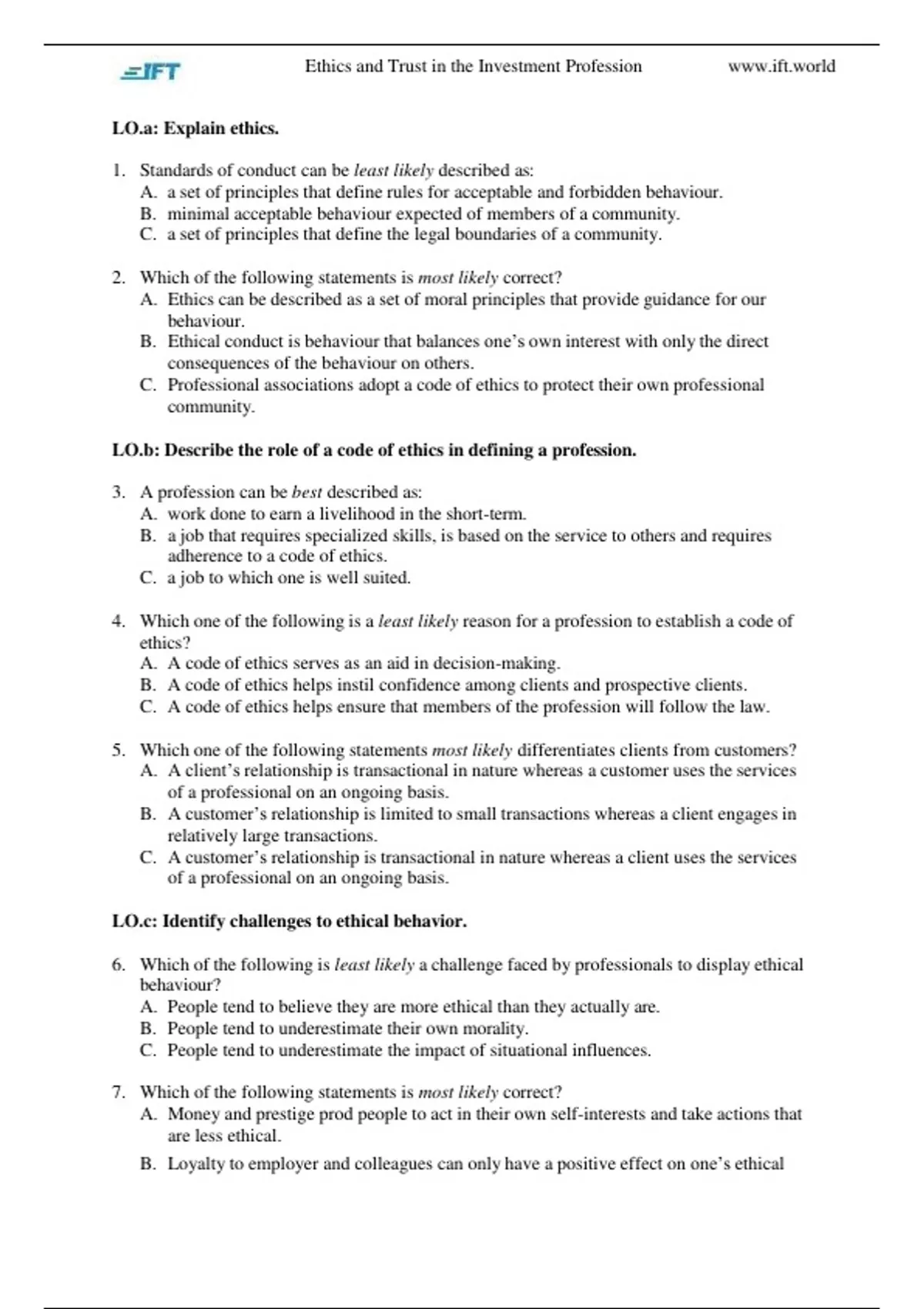 1. Standards of conduct can be least likely described as: A. a set of principles that define rules for acceptable and forbidden behaviour. B. minimal acceptable behaviour expected of members of a community. C. a set of principles that define the legal boundaries of a community. 2. Which of the following statements is most likely correct? A. Ethics can be described as a set of moral principles that provide guidance for our behaviour. B. Ethical conduct is behaviour that balances one’s own interest with only the direct consequences of the behaviour on others. C. Professional associations adopt a code of ethics to protect their own professional community. LO.b: Describe the role of a code of ethics in defining a profession. 3. A profession can be best described as: A. work done to earn a livelihood in the short-term. B. a job that requires specialized skills, is based on the service to others and requires adherence to a code of ethics. C. a job to which one is well suited. 4. Which one of the following is a least likely reason for a profession to establish a code of ethics? A. A code of ethics serves as an aid in decision-making. B. A code of ethics helps instil confidence among clients and prospective clients. C. A code of ethics helps ensure that members of the profession will follow the law. 5. Which one of the following statements most likely differentiates clients from customers? A. A client’s relationship is transactional in nature whereas a customer uses the services of a professional on an ongoing basis. B. A customer’s relationship is limited to small transactions whereas a client engages in relatively large transactions. C. A customer’s relationship is transactional in nature whereas a client uses the services of a professional on an ongoing basis. LO.c: Identify challenges to ethical behavior. 6. Which of the following is least likely a challenge faced by professionals to display ethical behaviour? A. People tend to believe they are more ethical than they actually are. B. People tend to underestimate their own morality. C. People tend to underestimate the impact of situational influences. 7. Which of the following statements is most likely correct? A. Money and prestige prod people to act in their own self-interests and take actions that are less ethical. B. Loyalty to employer and colleagues can only have a positive effect on one’s ethical Ethics and Trust in the Investment Profession behaviour. C. Processes focused solely on compliance simplify decision making and help the larger cause. LO.d: Describe the need for high ethical standards in the investment industry. 8. Which of the following statements is least likely accurate? Trust is particularly important in the investment profession because: A. investment professionals have specialized knowledge and access to information is asymmetrical. B. products and services in the investment industry tend to be intangible. C. returns cannot be guaranteed for most types of investments. 9. Which of the following statements is most likely accurate? A. Ethical firms are subject to higher costs as compared to less ethical firms. B. Investors expect a lower return on their capital when they lose trust. C. Lack of trust in financial markets can lower investments consequently harming society. LO.e: Distinguish between ethical and legal standards. 10. Which of the following is most likely a good example of ethical conduct? A. Make appropriate choices even in the absence of clear laws. B. Restrict one’s behaviour to what is legally acceptable. C. Make sensible decisions that minimize the risks to one’s employer only. 11. Which of the following is least likely a reason for laws being insufficient to ensure ethical conduct among market participants? A. Laws can be interpreted differently. B. Laws are largely the same across jurisdictions. C. Passing a law takes significant time. LO.f: Describe and apply a framework for ethical decision making. 12. Which of the following statements about ethical decision framework is/are most likely accurate?  Statement 1: An ethical decision framework helps decision makers justify actions to stakeholders.  Statement 2: Too many choices can at best lead to inaction.  Statement 3: An ethical decision framework serves as a tool for investment professionals to choose the best possible alternative. A. Statement 1 and 3. B. Statement 3 only. C. Statement 1, 2 and 3. 13. Which of the following parties should an investment professional consider as stakeholders while making decisions in an ethical manner? A. Employer and clients only. B. Clients and market participants only. Ethics and Trust in the Investment Profession C. Employer, clients, family and market participants. 14. Which of the following would be a step in the consideration phase in an ethical decisionmaking process? A. Assess the decision to see if it had the desired outcome. B. Seek guidance to navigate through situational influences. C. Assess any potential conflicts of interest. Solutions 1. C is correct. Standards of conduct can sometimes be different from what is stated in the law. Statements A and B are accurate descriptions of standards of conduct. 2. A is correct. Statement B is incorrect because ethical conduct is behaviour that balances one’s own interest with the direct and indirect consequences of the behaviour on others. Statement C is incorrect. 3. B is correct. A profession is a type of job that 1) requires specialized training and skills, 2) is based on service to others, and 3) is practiced by members who share and adhere to a common code of ethics. 4. C is correct. The code of ethics cannot ensure that members of the profession will follow the law. Statements A and B are true. 5. C is correct. Clients differ from customers. A customer is one who engages in a single or a series of transactions to buy a good or service. The relationship is transactional in nature. A client, on the other hand, uses the services of a profe