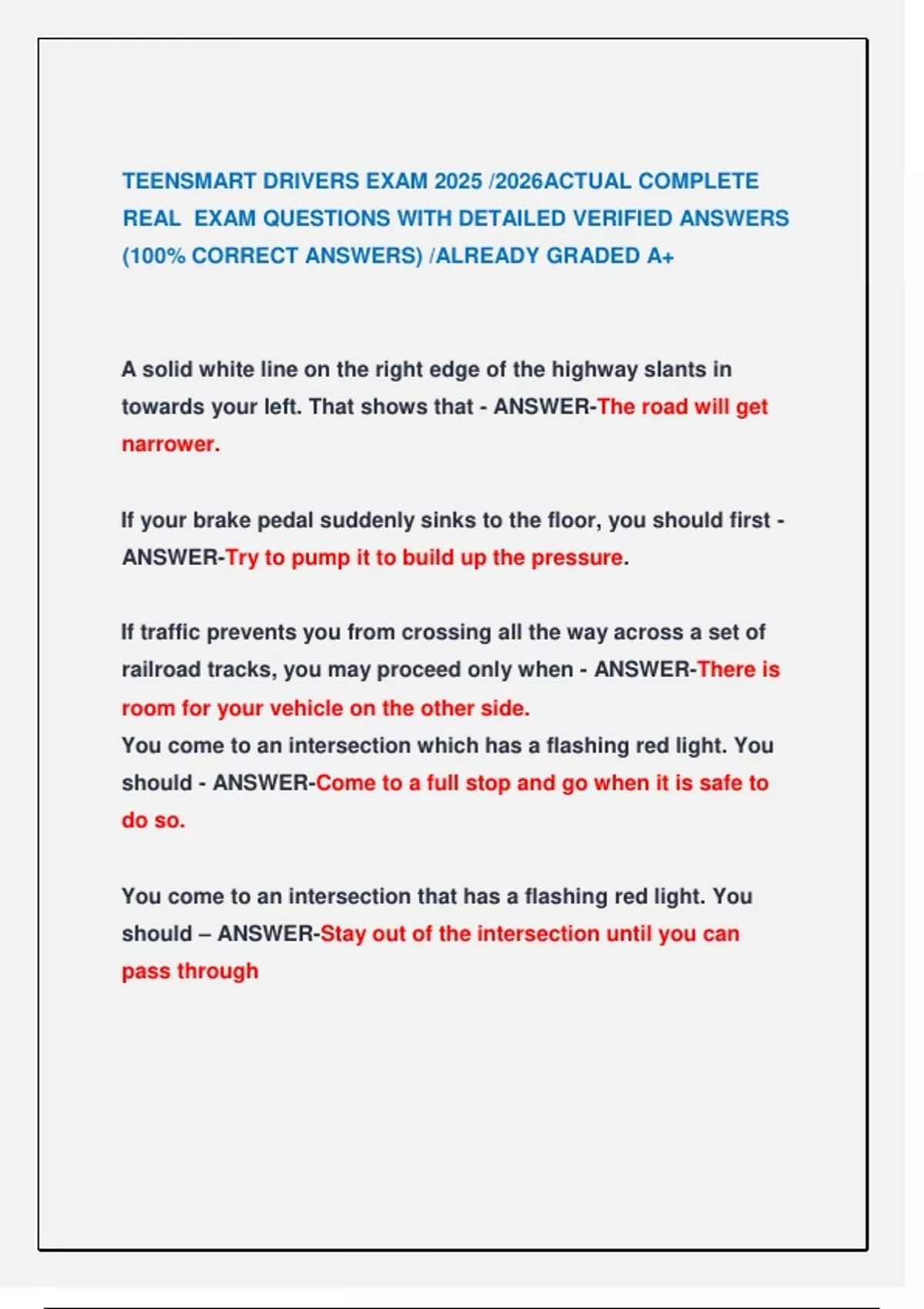 TEENSMART DRIVERS EXAM 2025 /2026ACTUAL COMPLETE REAL EXAM QUESTIONS WITH DETAILED VERIFIED ANSWERS (100% CORRECT ANSWERS) /ALREADY GRADED A+ TEENSMART DRIVERS EXAM 2025 /2026ACTUAL COMPLETE REAL EXAM QUESTIONS WITH DETAILED VERIFIED ANSWERS (100% CORRECT ANSWERS) /ALREADY GRADED A+ TEENSMART DRIVERS EXAM 2025 /2026ACTUAL COMPLETE REAL EXAM QUESTIONS WITH DETAILED VERIFIED ANSWERS (100% CORRECT ANSWERS) /ALREADY GRADED A+ TEENSMART DRIVERS EXAM 2025 /2026ACTUAL COMPLETE REAL EXAM QUESTIONS WITH DETAILED VERIFIED ANSWERS (100% CORRECT ANSWERS) /ALREADY GRADED A+ TEENSMART DRIVERS EXAM 2025 /2026ACTUAL COMPLETE REAL EXAM QUESTIONS WITH DETAILED VERIFIED ANSWERS (100% CORRECT ANSWERS) /ALREADY GRADED A+ TEENSMART DRIVERS EXAM 2025 /2026ACTUAL COMPLETE REAL EXAM QUESTIONS WITH DETAILED VERIFIED ANSWERS (100% CORRECT ANSWERS) /ALREADY GRADED A+ TEENSMART DRIVERS EXAM 2025 /2026ACTUAL COMPLETE REAL EXAM QUESTIONS WITH DETAILED VERIFIED ANSWERS (100% CORRECT ANSWERS) /ALREADY GRADED A+ TEENSMART DRIVERS EXAM 2025 /2026ACTUAL COMPLETE REAL EXAM QUESTIONS WITH DETAILED VERIFIED ANSWERS (100% CORRECT ANSWERS) /ALREADY GRADED A+