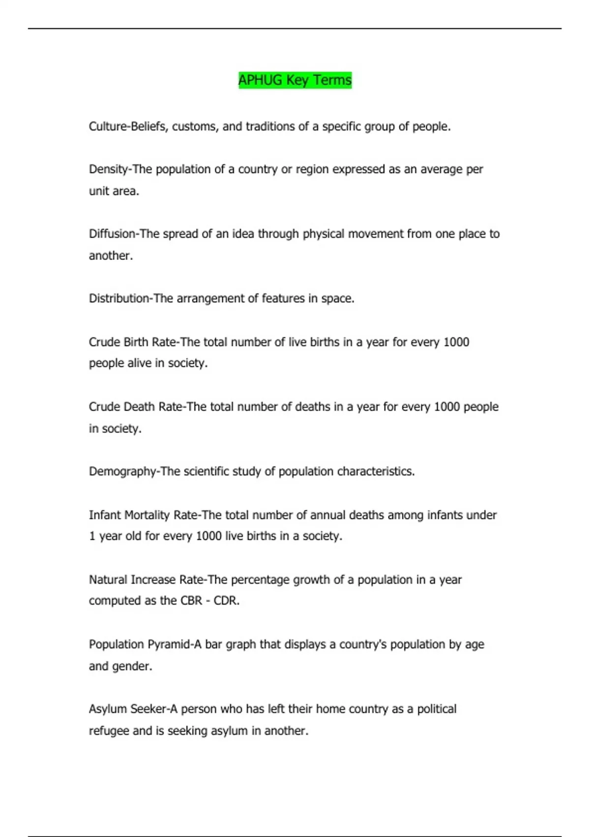 APHUG Key Terms Culture-Beliefs, customs, and traditions of a specific group of people. Density-The population of a country or region expressed as an average per unit area. Diffusion-The spread of an idea through physical movement from one place to another. Distribution-The arrangement of features in space. Crude Birth Rate-The total number of live births in a year for every 1000 people alive in society. Crude Death Rate-The total number of deaths in a year for every 1000 people in society. Demography-The scientific study of population characteristics. Infant Mortality Rate-The total number of annual deaths among infants under 1 year old for every 1000 live births in a society. Natural Increase Rate-The percentage growth of a population in a year computed as the CBR - CDR. Population Pyramid-A bar graph that displays a country's population by age and gender. Asylum Seeker-A person who has left their home country as a political refugee and is seeking asylum in another. Chain Migration-The social process by which immigrants from a particular town follow one another to a different city. Immigration-Migration to a location. Pull Factor-Positive conditions that induce people to new locations from other areas. Push Factor-Negative conditions that induce people to leave their abode and migrate to a new location. Refugees-People who have fled their country because of political persecution and seek asylum in another country. Custom-The frequent repetition of an act to the extent that it becomes characteristic of the group of people performing the act. Folk Culture-Culture practiced by a small homogenous rural group living in isolation. Popular Culture-Culture found in a large heterogenous society that shares certain habits despite differences in other personal characteristics. Habit-Repetitive act performed by an individual. Dialect-A regional variety of a language distinguished by vocabulary, spelling, and pronunciation. Lingua Franca-a common language used by speakers of different languages Official Language-language adopted for use by the government for conduct of business and publication of documents Fundamentalism-The strict adherence to a particular doctrine. Universalizing Religion-A religion that attempts to appeal to all people, not just those living in a particular location.