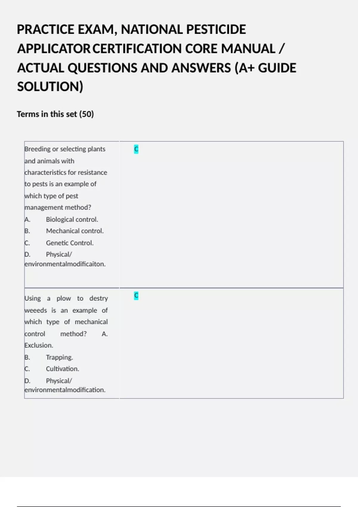 PRACTICE EXAM, NATIONAL PESTICIDE APPLICATOR CERTIFICATION CORE MANUAL / ACTUAL QUESTIONS AND ANSWERS (A+ GUIDE SOLUTION) Terms in this set (50) Breeding or selecting plants and animals with characteristics for resistance to pests is an example of which type of pest management method? A. Biological control. B. Mechanical control. C. Genetic Control. D. Physical/ environmentalmodificaiton. C Using a plow to destry weeeds is an example of which type of mechanical control method? A. Exclusion. B. Trapping. C. Cultivation. D. Physical/ environmentalmodification. C