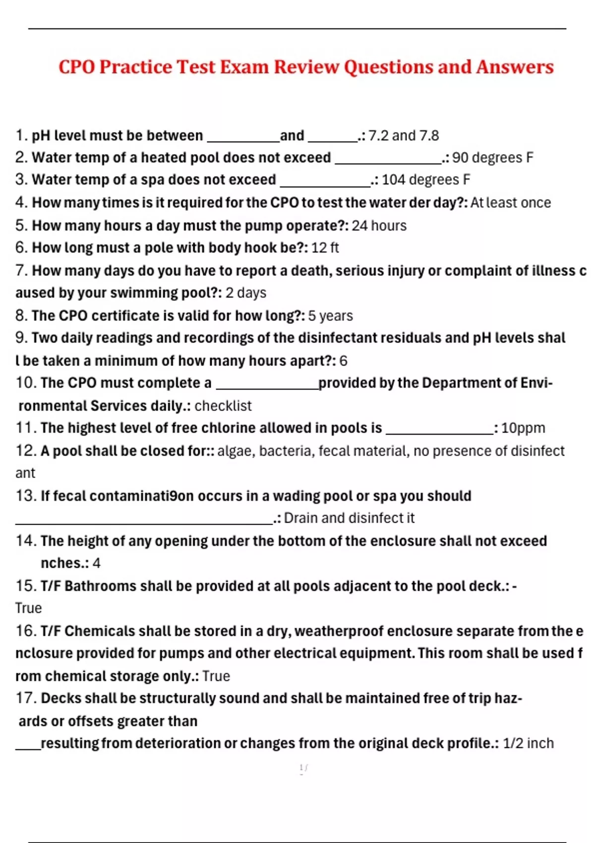 , 18. T/F Pets are allowed on the pool deck.: False