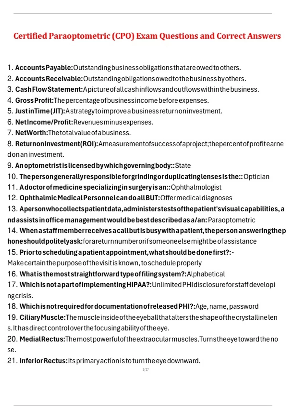Certified Paraoptometric (CPO) Exam Questions and Correct Answers
