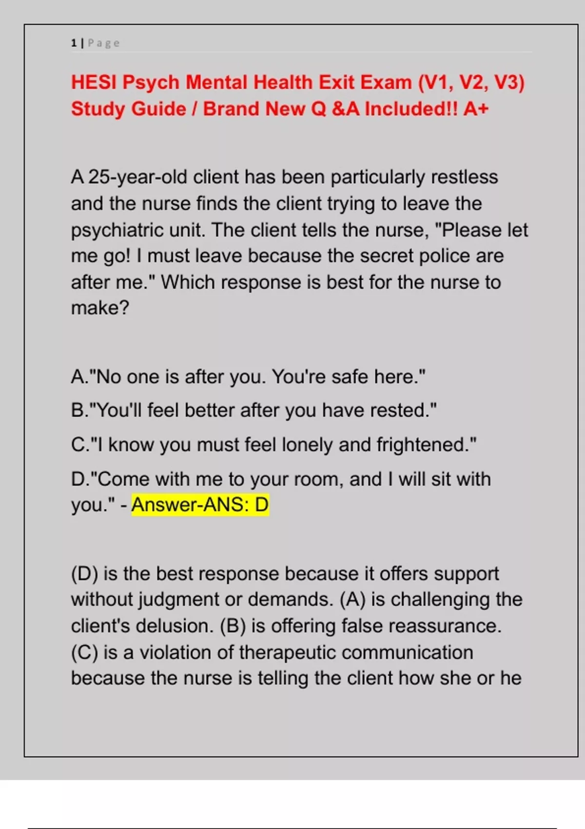 HESI Psych Mental Health Exit Exam (V1, V2, V3) Study Guide / Brand New Q &A Included!! A+