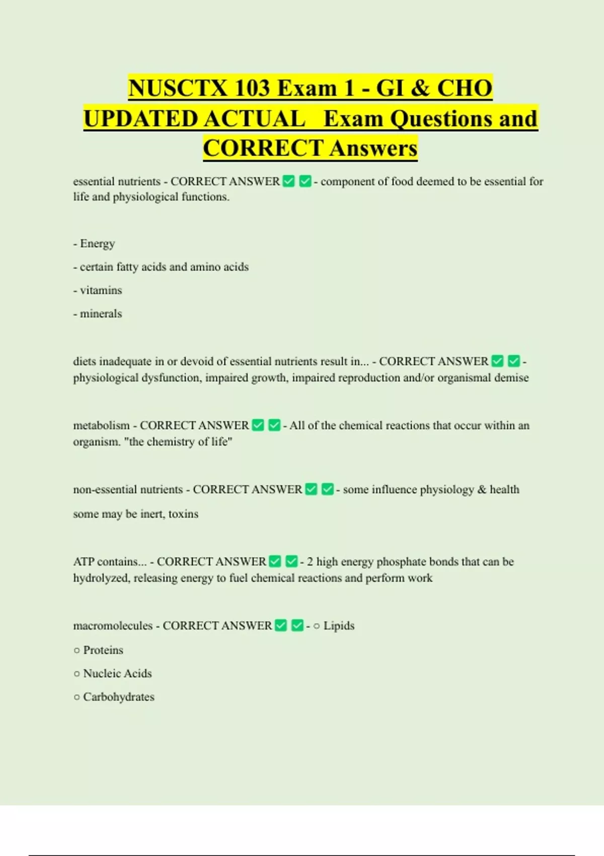 NUSCTX 103 Exam 1 - GI & CHO UPDATED ACTUAL Exam Questions and CORRECT Answers essential nutrients - CORRECT ANSWER - component of food deemed to be essential for life and physiological functions. - Energy - certain fatty acids and amino acids - vitamins - minerals