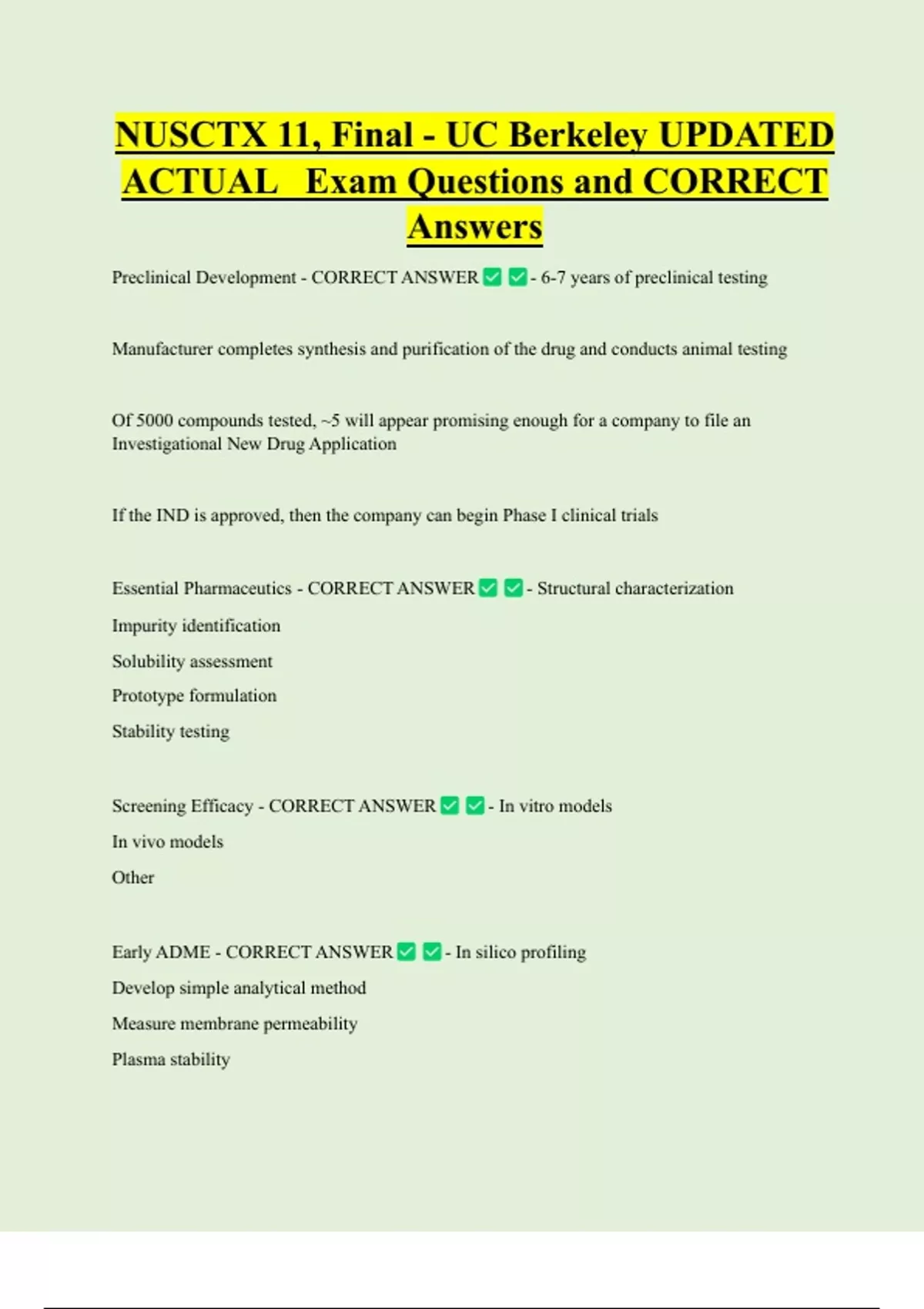 NUSCTX 11, Final - UC Berkeley UPDATED ACTUAL Exam Questions and CORRECT Answers Preclinical Development - CORRECT ANSWER - 6-7 years of preclinical testing Manufacturer completes synthesis and purification of the drug and conducts animal testing Of 5000 compounds tested, ~5 will appear promising enough for a company to file an Investigational New Drug Application