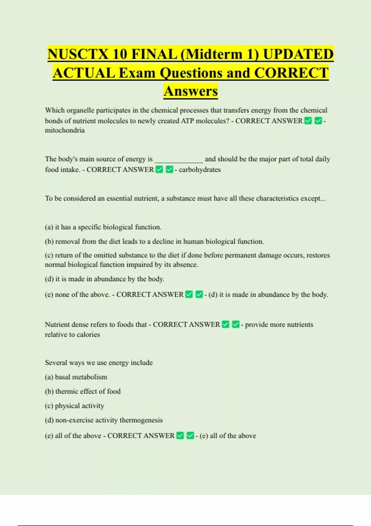NUSCTX 10 FINAL (Midterm 1) UPDATED ACTUAL Exam Questions and CORRECT Answers Which organelle participates in the chemical processes that transfers energy from the chemical bonds of nutrient molecules to newly created ATP molecules? - CORRECT ANSWER - mitochondria The body's main source of energy is _____________ and should be the major part of total daily food intake. - CORRECT ANSWER - carbohydrates