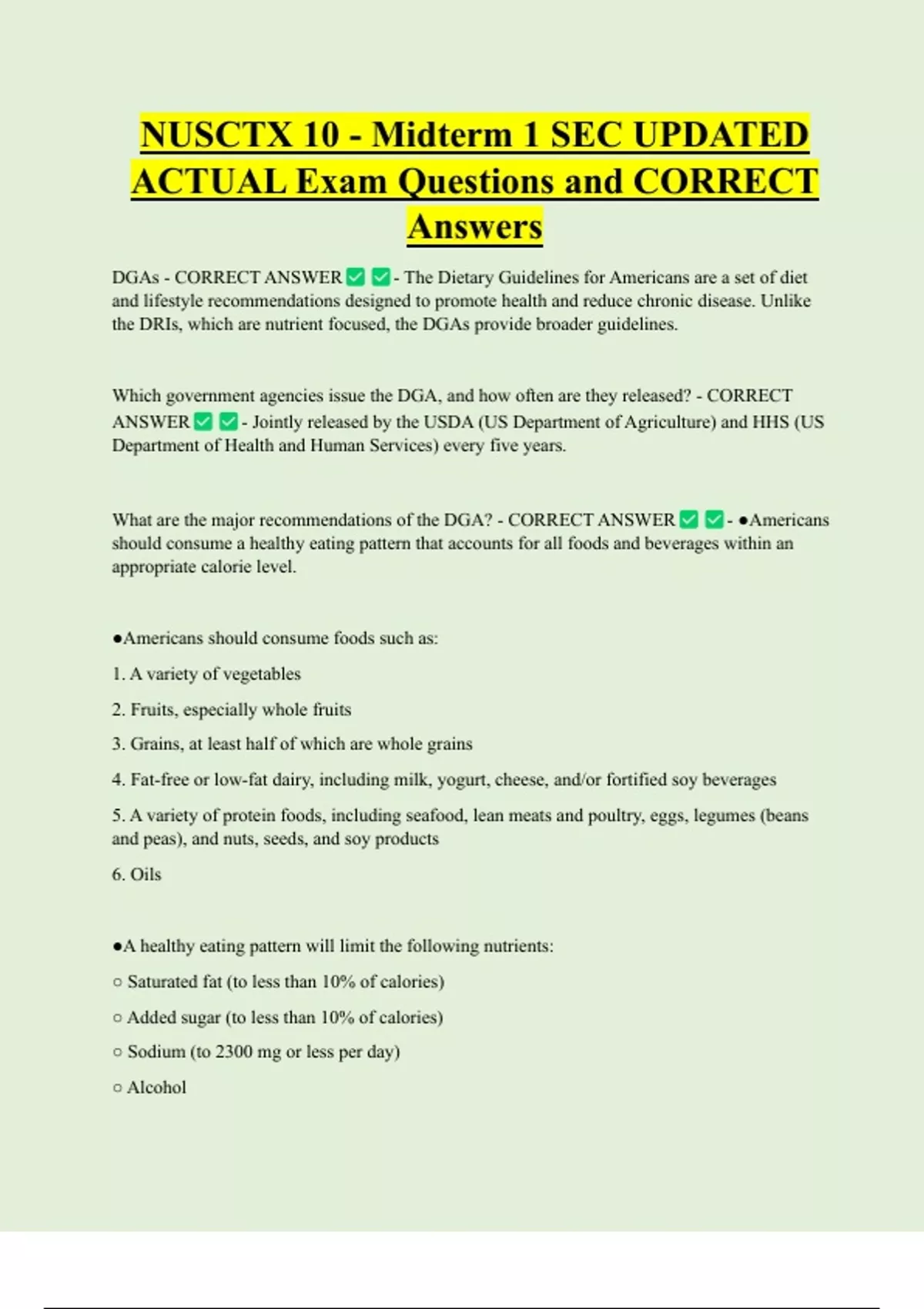 NUSCTX 10 - Midterm 1 SEC UPDATED ACTUAL Exam Questions and CORRECT Answers DGAs - CORRECT ANSWER - The Dietary Guidelines for Americans are a set of diet and lifestyle recommendations designed to promote health and reduce chronic disease. Unlike the DRIs, which are nutrient focused, the DGAs provide broader guidelines