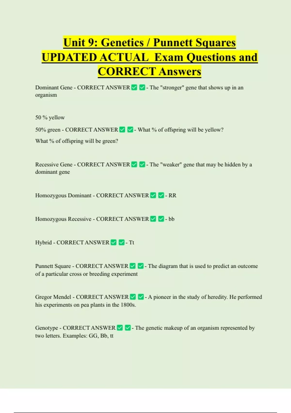 Unit 9: Genetics / Punnett Squares UPDATED ACTUAL Exam Questions and CORRECT Answers Dominant Gene - CORRECT ANSWER - The "stronger" gene that shows up in an organism 50 % yellow 50% green - CORRECT ANSWER - What % of offspring will be yellow? What % of offspring will be green?
