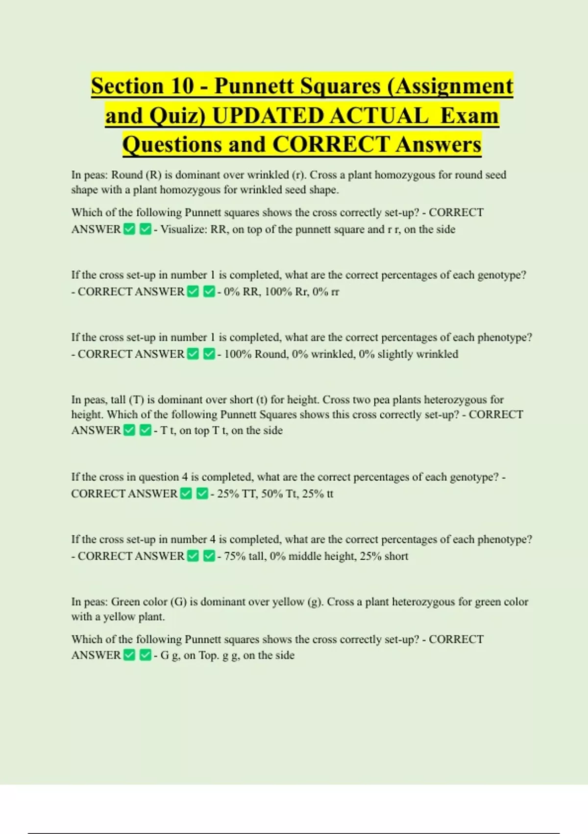 Section 10 - Punnett Squares (Assignment and Quiz) UPDATED ACTUAL Exam Questions and CORRECT Answers