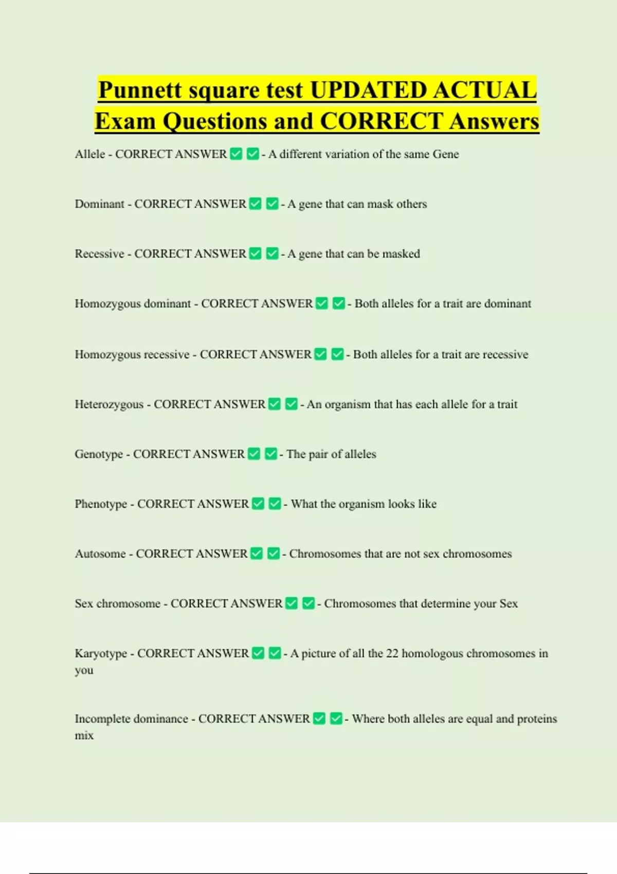 Homozygous dominant - CORRECT ANSWER - Both alleles for a trait are dominant