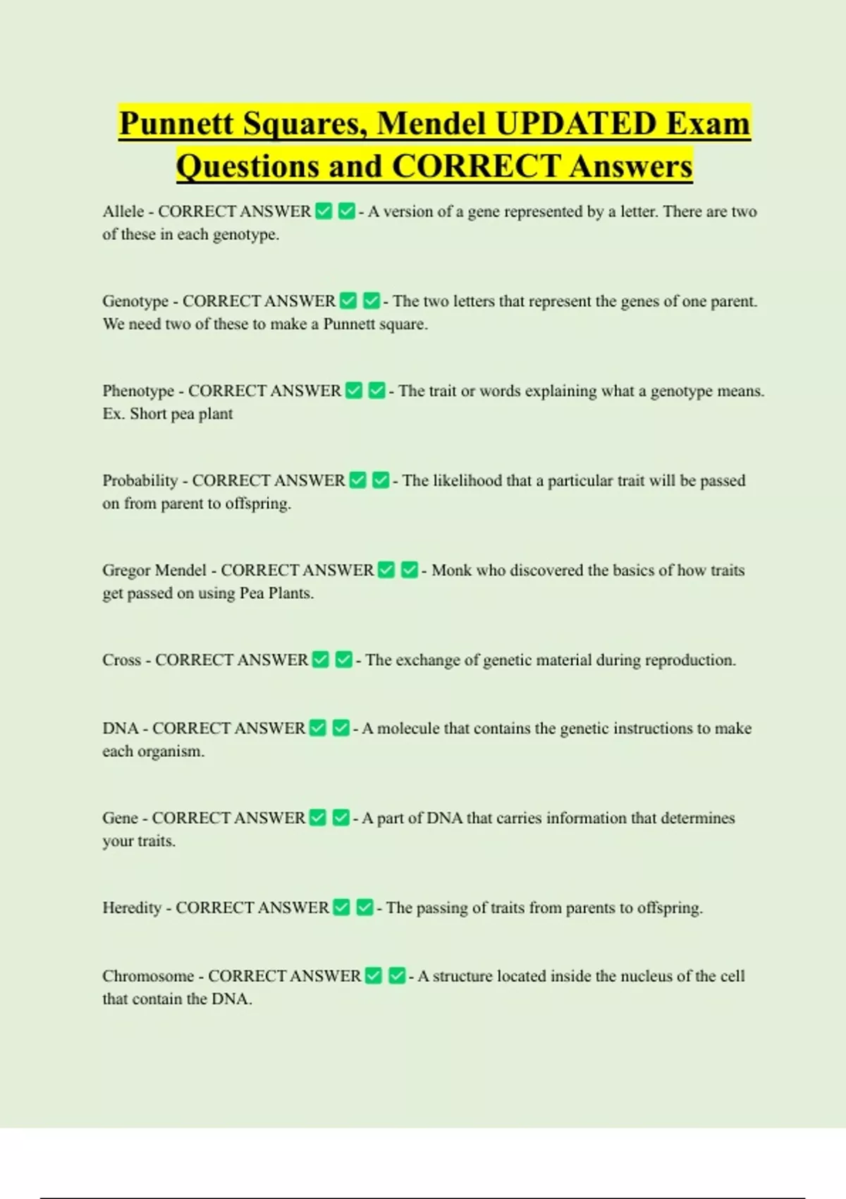 Punnett Squares, Mendel UPDATED Exam Questions and CORRECT Answers