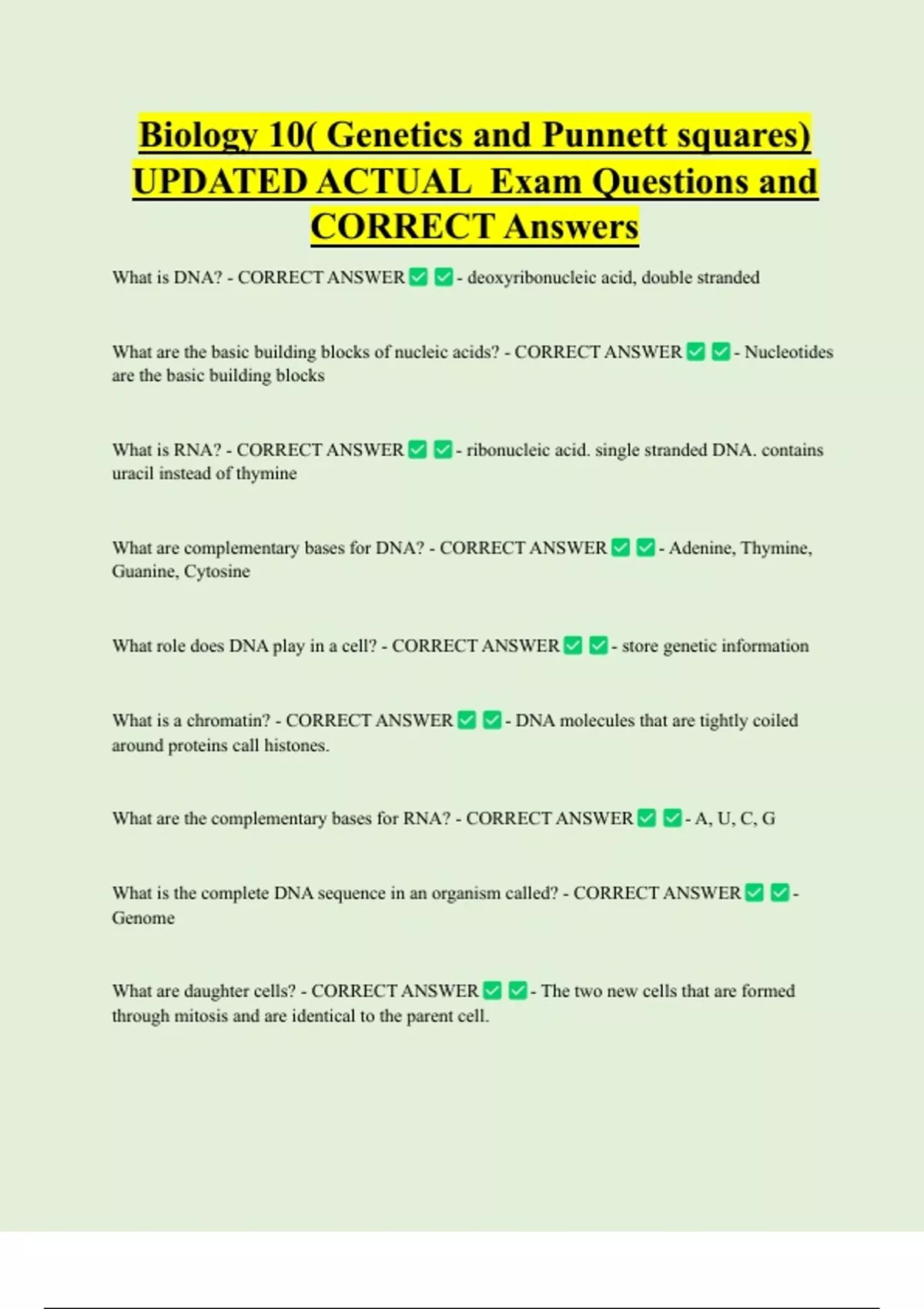 Biology 10( Genetics and Punnett squares) UPDATED ACTUAL Exam Questions and CORRECT Answers What is DNA? - CORRECT ANSWER - deoxyribonucleic acid, double stranded What are the basic building blocks of nucleic acids? - CORRECT ANSWER - Nucleotides are the basic building block