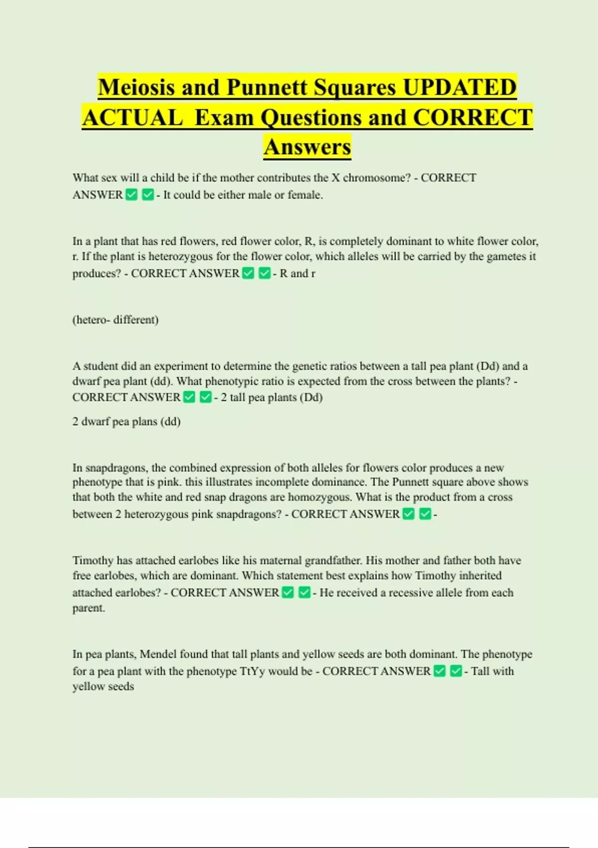 Meiosis and Punnett Squares UPDATED ACTUAL Exam Questions and CORRECT Answers
