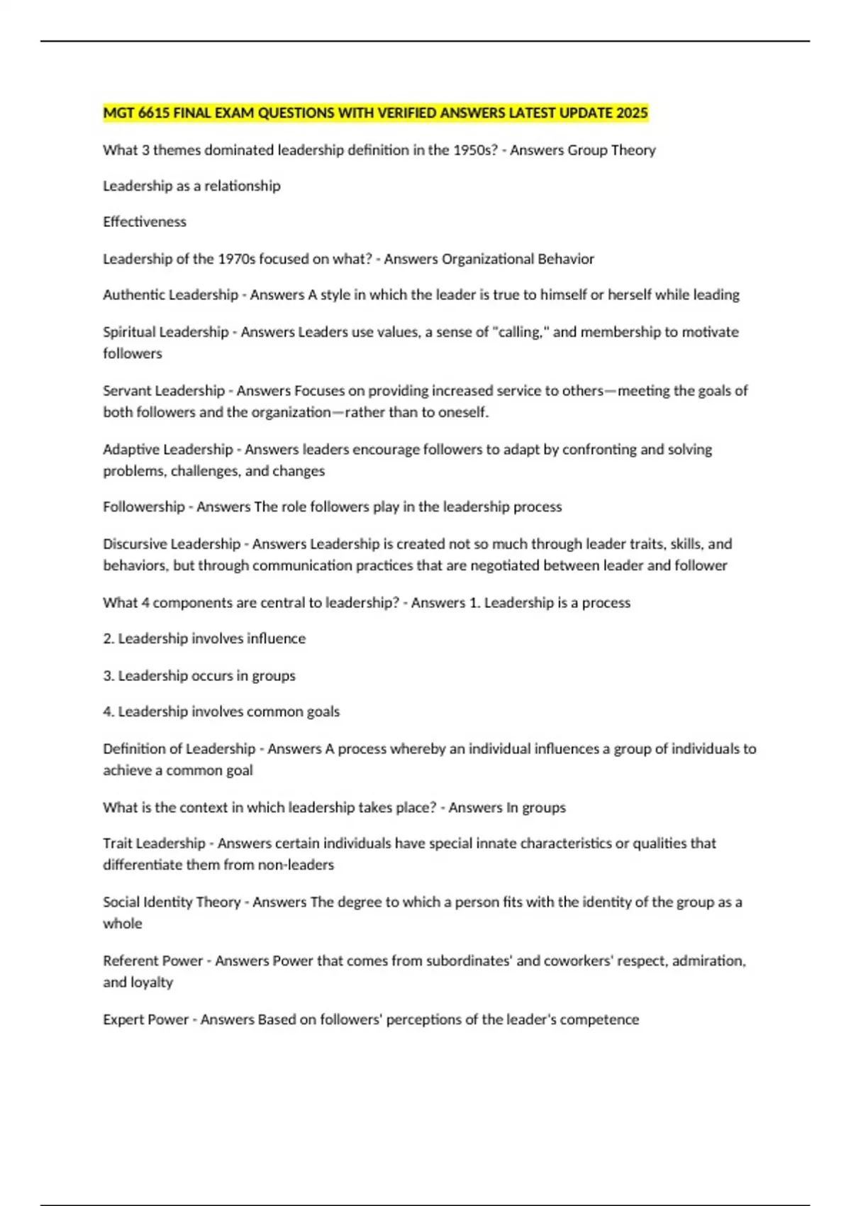 What 4 components are central to leadership? - Answers 1. Leadership is a process