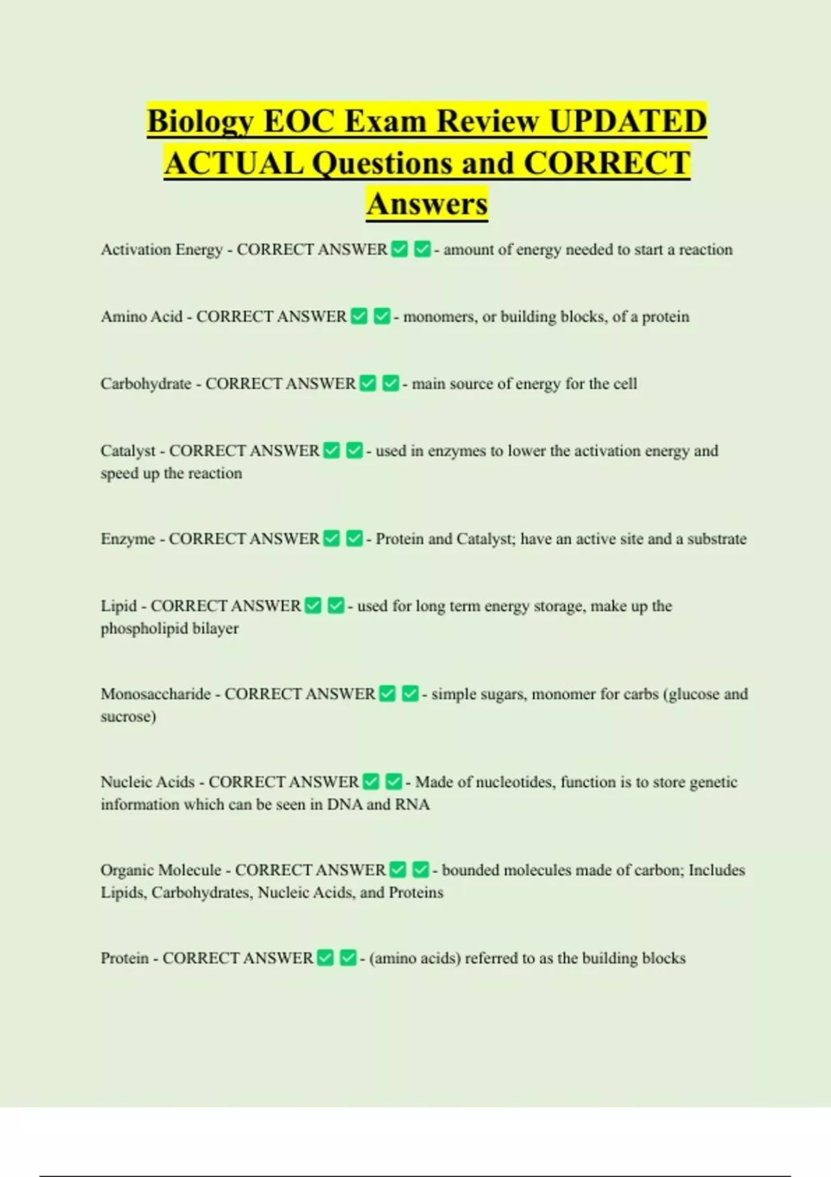 Catalyst - CORRECT ANSWER - used in enzymes to lower the activation energy and