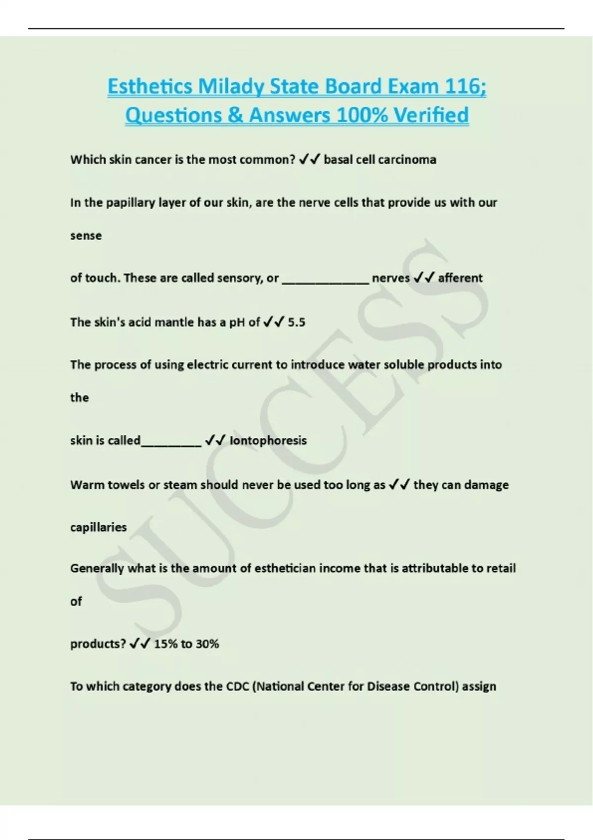 Esthetics Milady State Board Exam 116; Questions & Answers|Latest Update