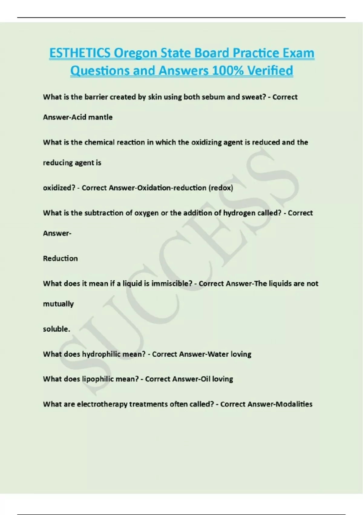 ESTHETICS Oregon State Board Practice Exam Questions and Answers 100% Correct