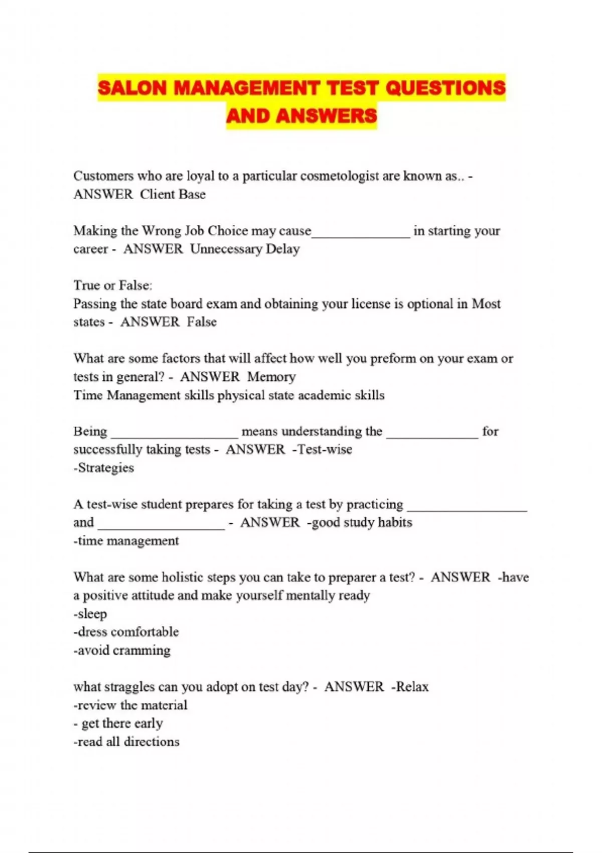 SALON MANAGEMENT TEST QUESTIONS AND ANSWERS....